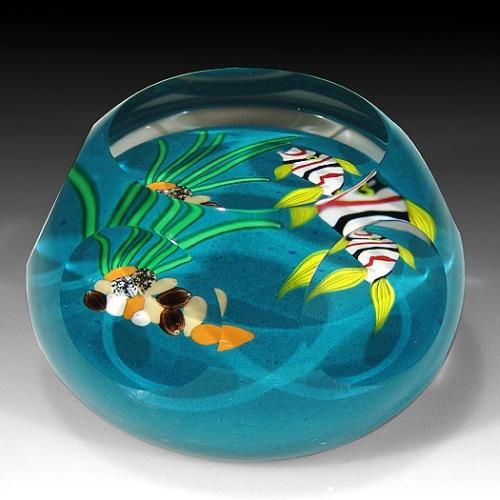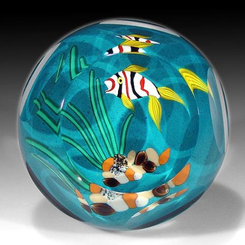 Perthshire Paperweights 1999 "Tropical Fish" paperweight, with a striped fish and green seaweed, on opaque aqua ground. Five and one facets. Signature/date cane. Limited edition #171 of 200. Diameter 2 5/8". Includes collector certificate. NO RESERVE