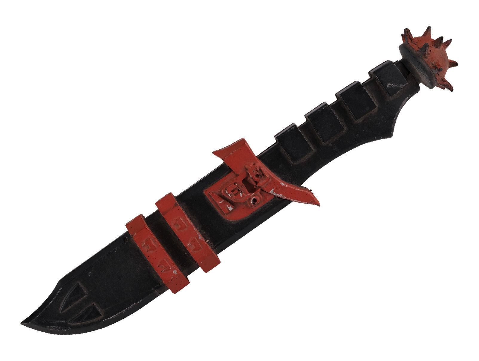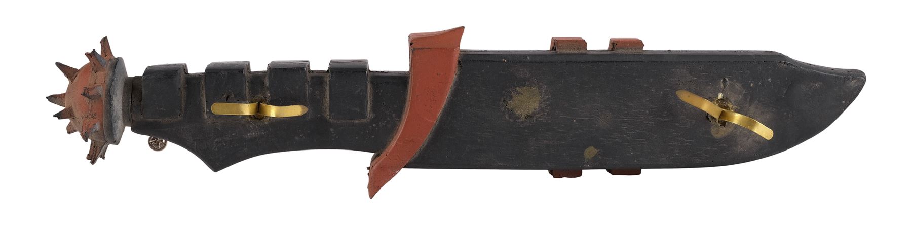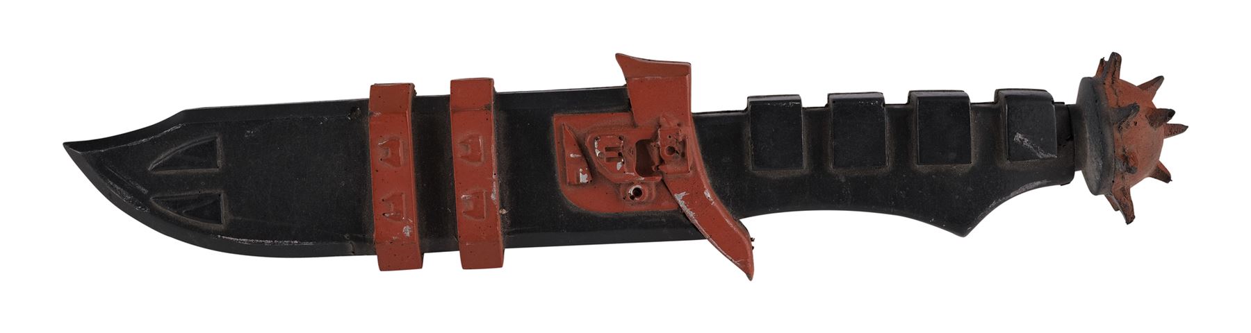 This lot comes from the collection of celebrated Star Trek franchise artists and advisors Michael and Denise Okuda, who received it as a gift from renowned model-maker Greg Jein. This static knife-in-a-sheath is composed of foam painted black and burnt orange. It features a notable spiked pommel. The back of the weapon has two brass brads inserted in the sheath and grip. This lot exhibits chipping, pitting, cracks, discoloration, and a buildup of grime. Dimensions: 13" x 3" x 2" (33 cm x 7.75 cm x 5 cm)Though their long and celebrated careers in the Star Trek world began in features, Michael and Denise Okuda established themselves as franchise legends while working on Star Trek: The Next Generation. Michael became art supervisor on TNG, while Denise came on as a scenic artist during Deep Space Nine, roles they would continue to perform through Voyager, Enterprise, and the Next Generation films. Married in 1993, the Okudas are known as the driving forces behind the development of many of the now-iconic 24th-century technologies seen throughout the series, including the famous "Okudagrams" they created for the LCARS (Library Computer Access and Retrieval System) interfaces . Propstore is proud to present a selection of key memorabilia from the personal collection of one of the franchise's most important creative teams to the public for the first time.