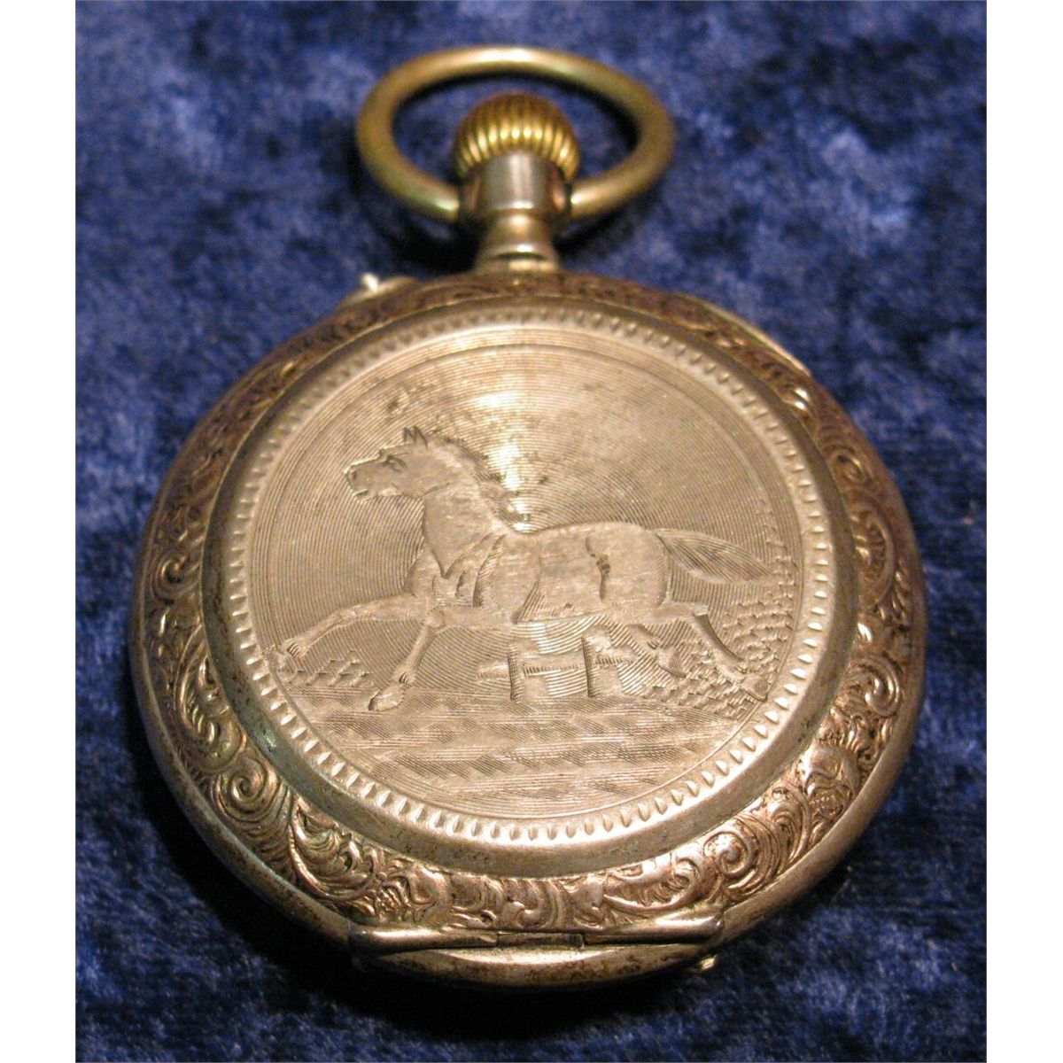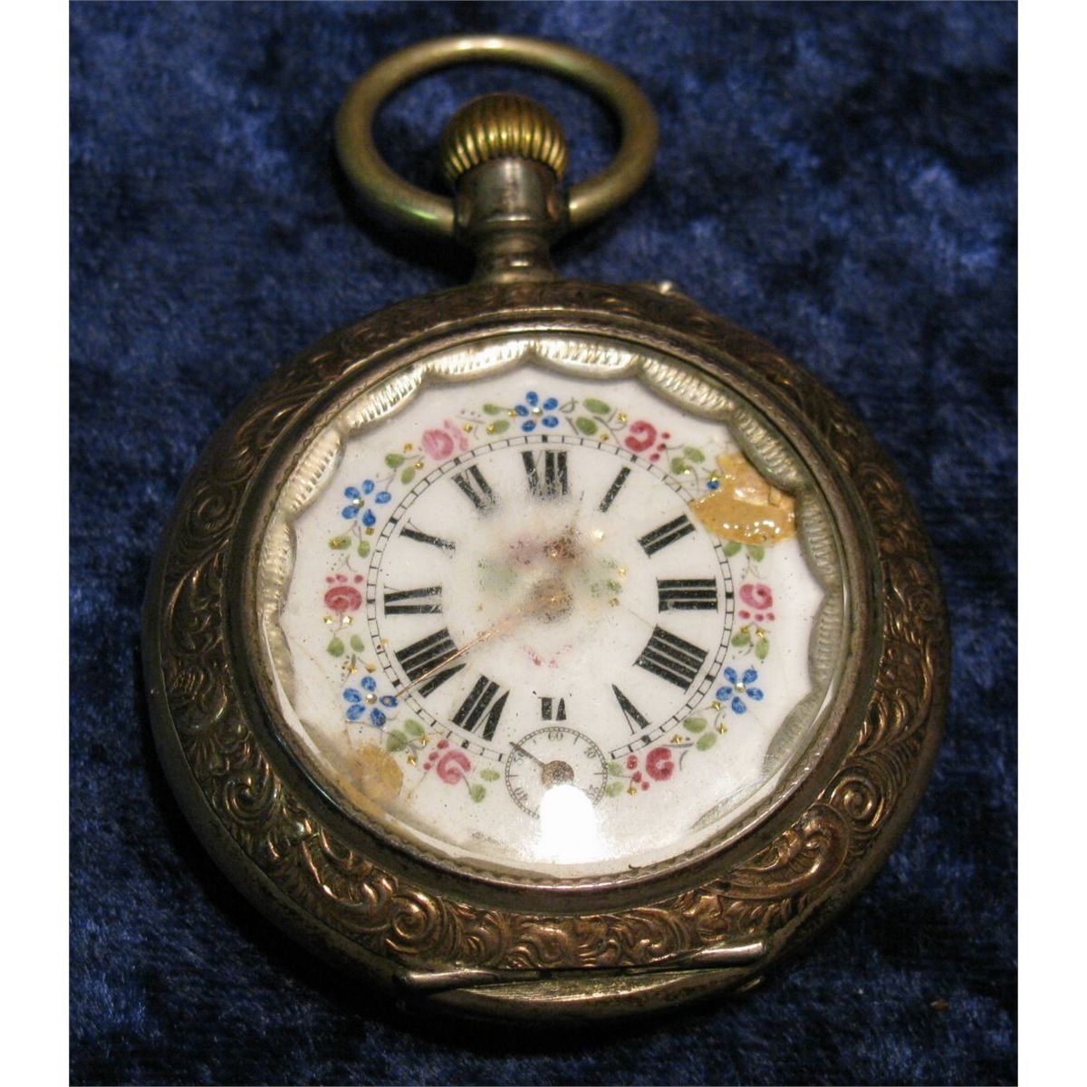 1431. .800 Fine Silver Highly engraved Pocket Watch with floral dial and Gold highlighting. Equestrian design. Sorry, appears to be wound too tight.