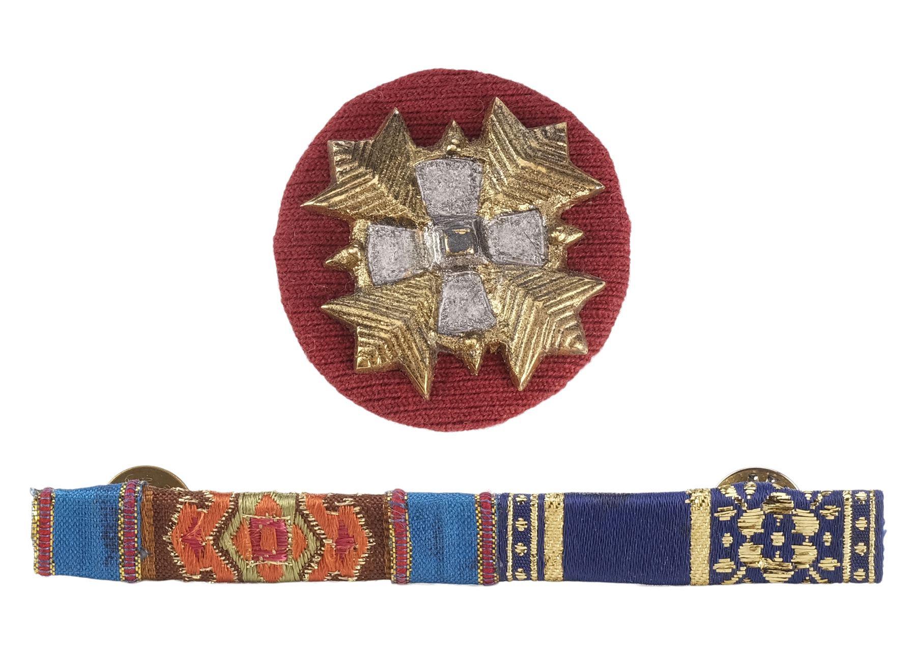 This lot, from the collection of celebrated Star Trek franchise artists and advisors Michael and Denise Okuda, consists of one metal and red wool circular pin featuring a gold- and silver-color metal insignia; and one wooden pin wrapped in multicolored embroidery. This lot exhibits tarnishing to the insignia. Dimensions: (largest) 4" x 0.25" x 0.25" (10.25 cm x 0.75 cm x 0.75 cm)Though their long and celebrated careers in the Star Trek world began in features, Michael and Denise Okuda established themselves as franchise legends while working on Star Trek: The Next Generation. Michael became art supervisor on TNG, while Denise came on as a scenic artist during Deep Space Nine, roles they would continue to perform through Voyager, Enterprise, and the Next Generation films. Married in 1993, the Okudas are known as the driving forces behind the development of many of the now-iconic 24th-century technologies seen throughout the series, including the famous "Okudagrams" they created for the LCARS (Library Computer Access and Retrieval System) interfaces . Propstore is proud to present a selection of key memorabilia from the personal collection of one of the franchise's most important creative teams to the public for the first time.
