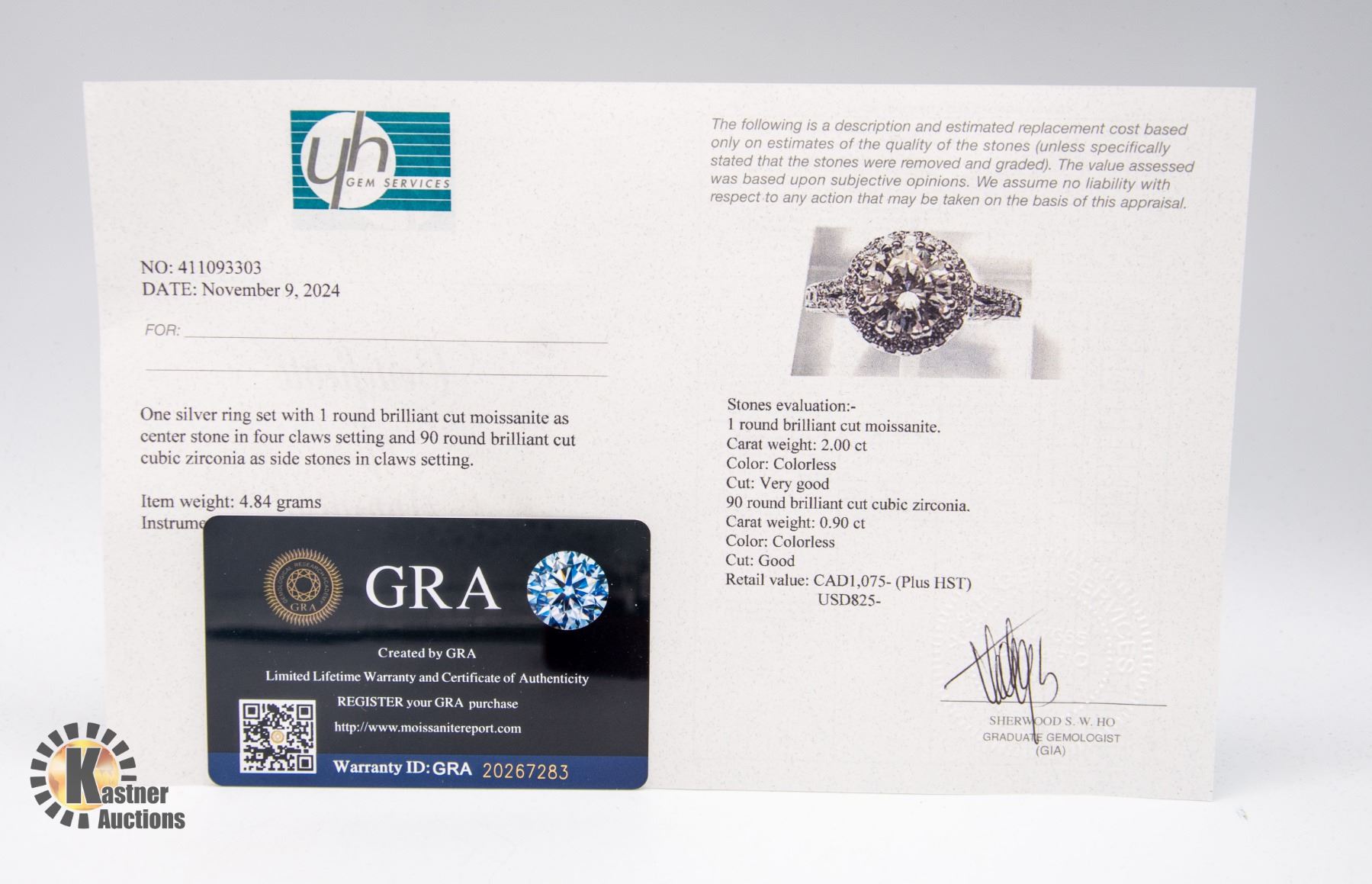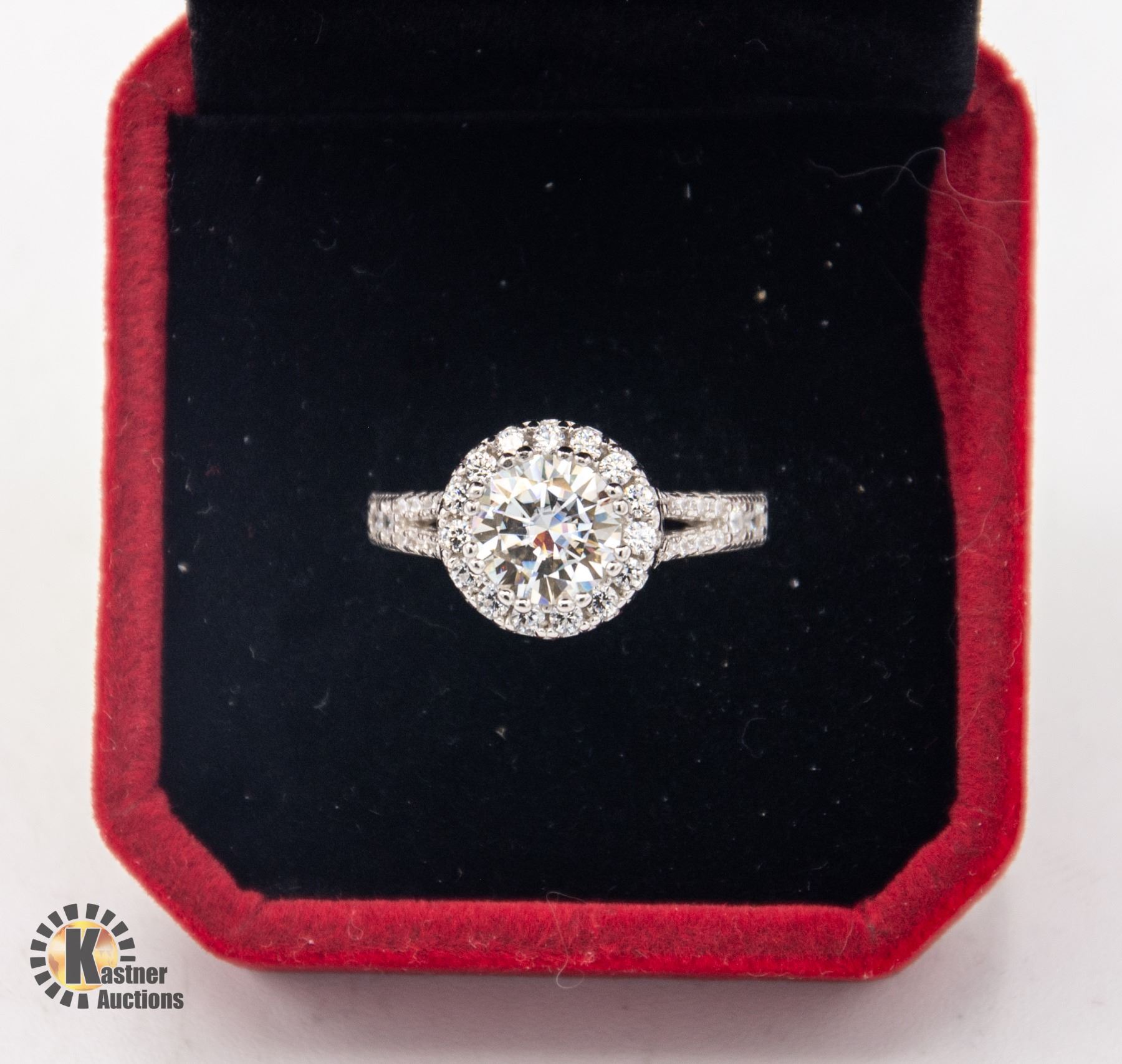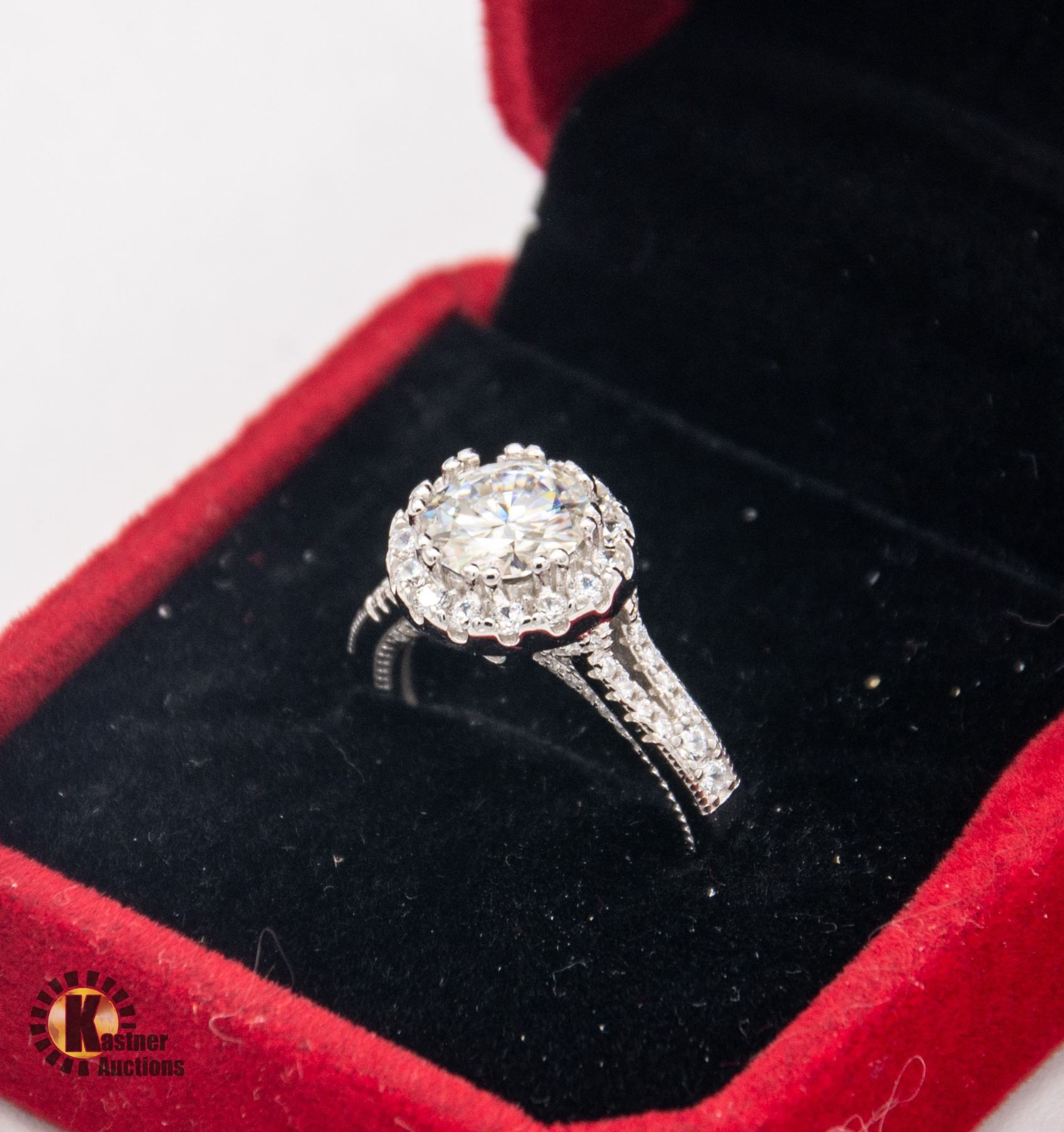 BRILLIANT CUT MOISSANITE STONE VVS D COLOR SET IN CENTER WITH 90 ROUND BRILLIANT CUT CUBIC ZIRCONIA SET IN HALO AND IN SHANKS SET IN 925 SILVER RING SIZE 7 RETAIL VALUE $1,075.00 **ALL ITEMS MUST BE REMOVED BY 5PM SATURDAY, JANUARY 4TH 2025. ALL REMAINING ITEMS WILL BE SUBJECT TO A $6.00 PER DAY STORAGE CHARGE. ANY ITEMS REMAINING AFTER MONDAY, JANUARY 27TH 2025 WILL BE CONSIDERED FORFEITED. NO REFUNDS WILL BE ISSUED FOR FORFEITED ITEMS. TO SCHEDULE A PICK UP APPOINTMENT CLICK HERE