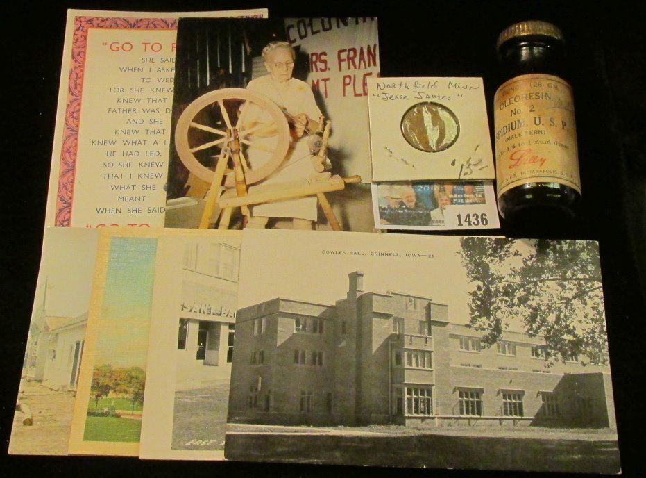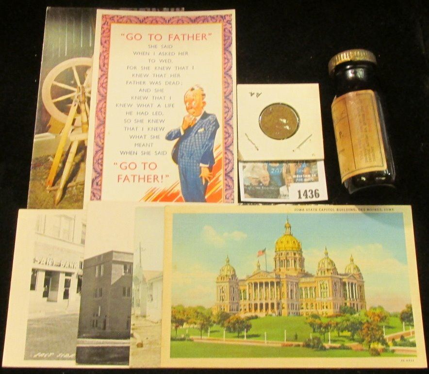 Early 1900 era Medicine Bottle "Lilly Oleoresin No. 2 Aspidium, U.S.P"; "Biagio's/Family/Entertainment/Northfield, Mn.", "Biagio's Deli/Finest/Meats & Cheeses" Token (Jesse James Gang fame); & several old Iowa related Post cards.