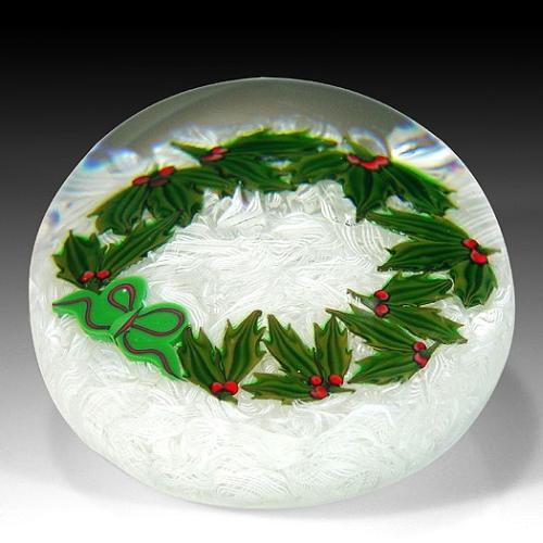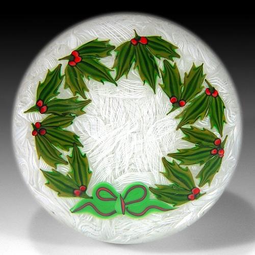 Perthshire Paperweights 1983 Christmas holly wreath paperweight, with green leaves, red berries, and a red and green bow, on white upset muslin. Signature/date cane. Limited edition of 350. Diameter 2 7/8". NO RESERVE
