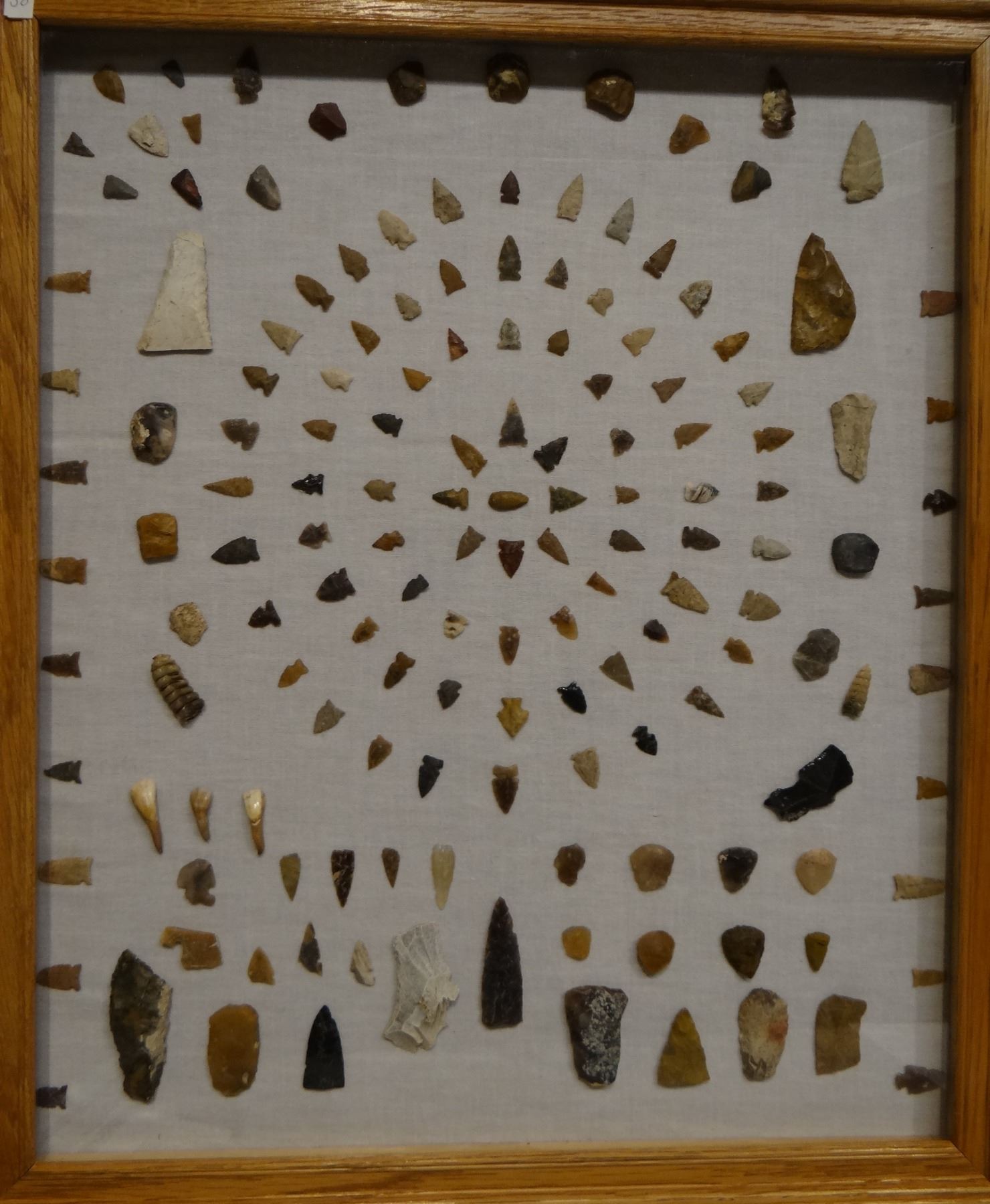 144 artifacts, in 22" x 26" frame, arrowheads, scrapers, knives, buffalo teeth, all found in Sun Riv