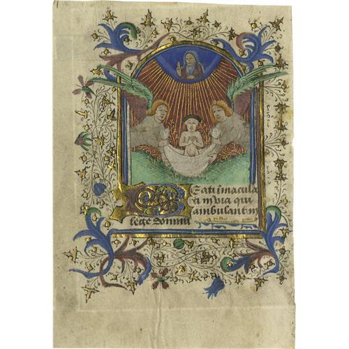 <B><I>Horae B.M.V.</B></I></B></I> <B>1440 Illuminated Manuscript Leaf- of the Bringing-Down of Christ to Earth</B></I> showing two angels carrying the Holy Infant with God in heaven offering His blessing. A miniature from a <I>Book of Hours,</B></I> France, 1440, manuscript on vellum, Latin text, 3" x 4.25". Arch-topped framed scene with decorative border burnished in gold, and a three-line illuminated initial also burnished in gold. The verso contains 12 lines of black and red text with a four illuminated initials. Each <I>Book of Hours</B></I> produced in medieval times was unique. They served as devotional works containing various prayers and meditations appropriate to seasons, months, days of the week, and hours of the day. This is a wonderful example of a miniature painting from one such book. From the Henry E. Luhrs Collection.