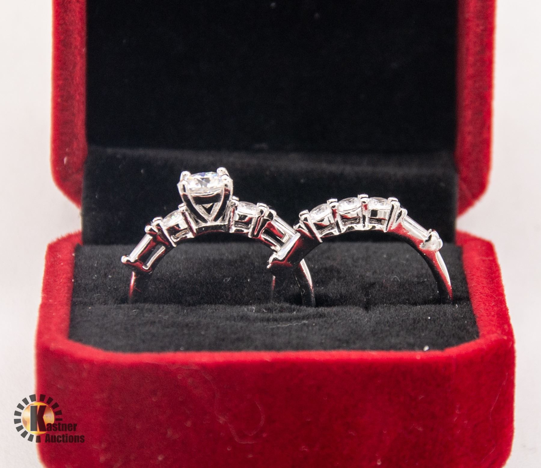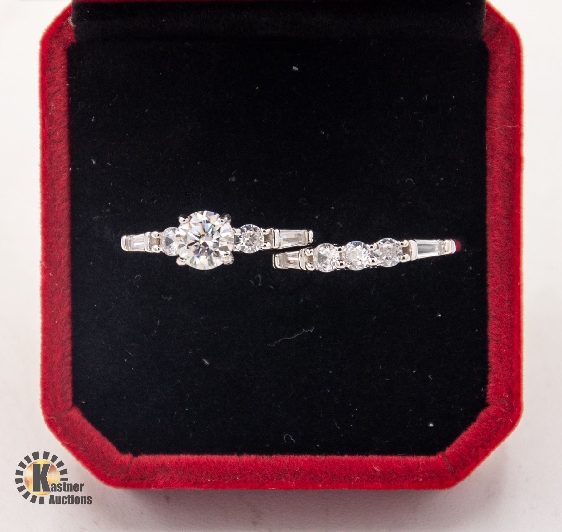 MOISSANITE SET IN CENTER OF ENGAGEMENT RING WITH ROUND CZ’S AND TAPERED BAGUETTES’ IN BOTH THE ENGAGEMENT AND THE WEDDING BAND ALL SET IN 925 SILVER RING SIZE ADJUSTABLE **ALL ITEMS MUST BE REMOVED BY 5PM SATURDAY, JANUARY 4TH 2025. ALL REMAINING ITEMS WILL BE SUBJECT TO A $6.00 PER DAY STORAGE CHARGE. ANY ITEMS REMAINING AFTER MONDAY, JANUARY 27TH 2025 WILL BE CONSIDERED FORFEITED. NO REFUNDS WILL BE ISSUED FOR FORFEITED ITEMS. TO SCHEDULE A PICK UP APPOINTMENT CLICK HERE