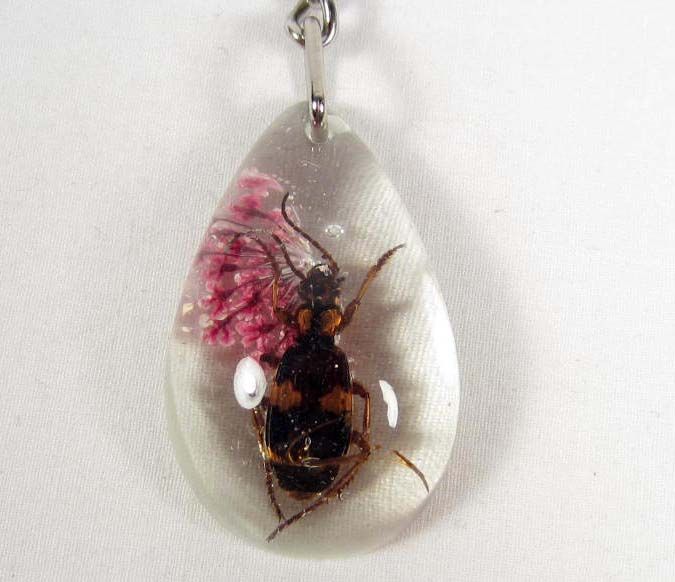1444 - BEETLE AND FLOWER IN CLEAR RESIN KEY CHAIN - 1.5"