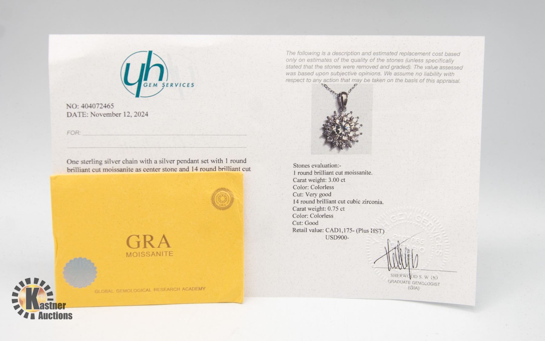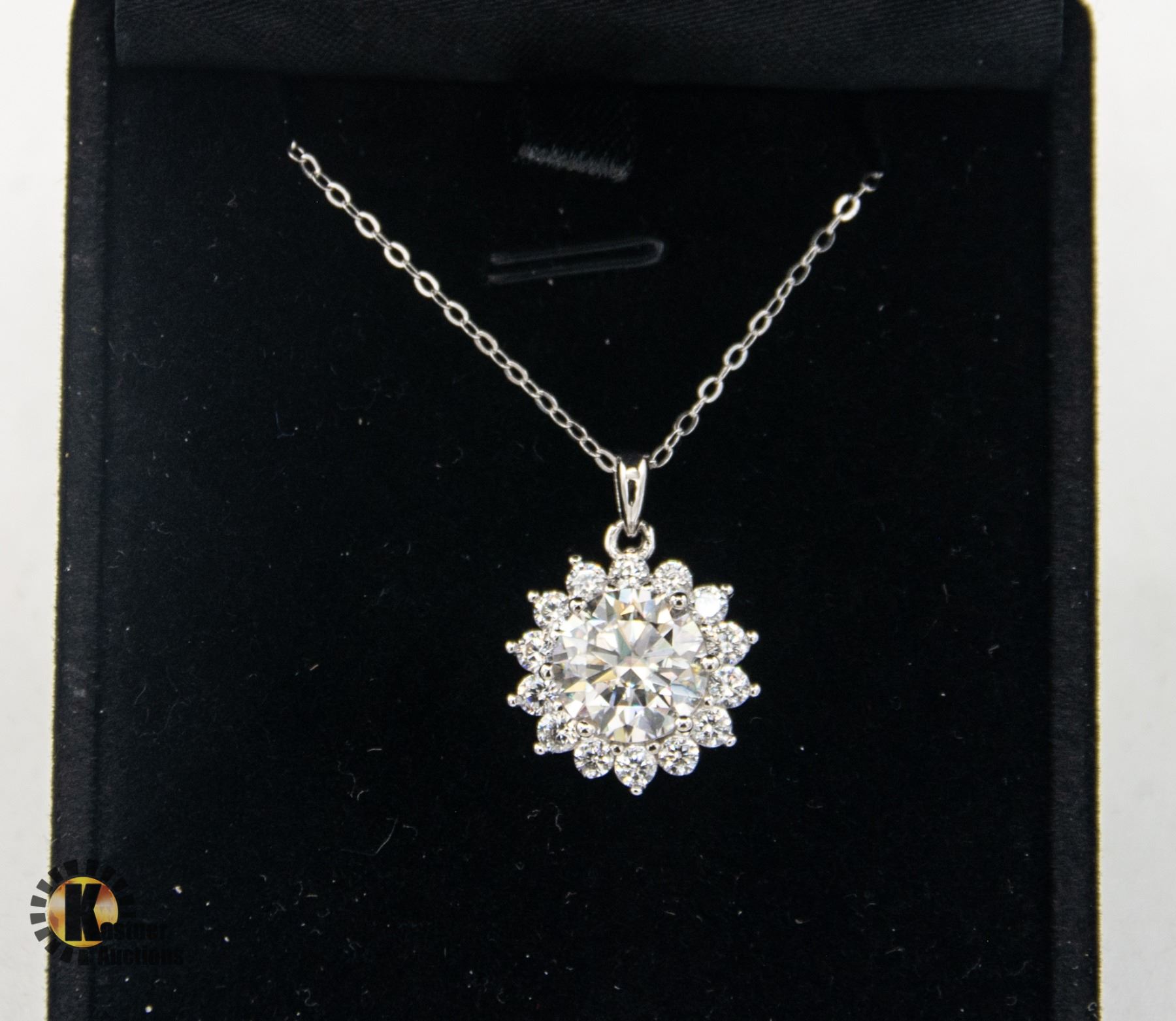 ROUND BRILLIANT CUT MOISSANITE STONE VVS D COLOR SURROUNDED BY 14 ROUND BRILLIANT CUT CUBIC ZIRCONIA SET IN 925 SILVER PENDANT RETAIL VALUE $1,175.00 **ALL ITEMS MUST BE REMOVED BY 5PM SATURDAY, JANUARY 4TH 2025. ALL REMAINING ITEMS WILL BE SUBJECT TO A $6.00 PER DAY STORAGE CHARGE. ANY ITEMS REMAINING AFTER MONDAY, JANUARY 27TH 2025 WILL BE CONSIDERED FORFEITED. NO REFUNDS WILL BE ISSUED FOR FORFEITED ITEMS. TO SCHEDULE A PICK UP APPOINTMENT CLICK HERE