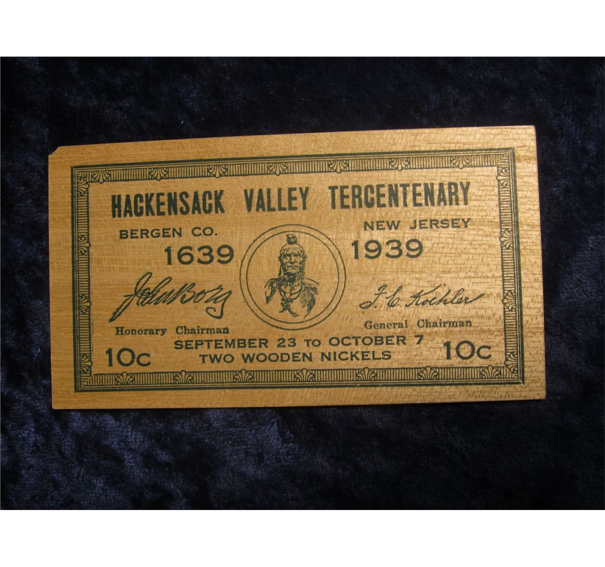 146. 1639-1939 Hackensack Valley Tercentenary Bergen Co. New Jersey Two Wooden Nickels Scrip. Issued in Commemoration of the 300th Anniversary of the Hackensack Valley.