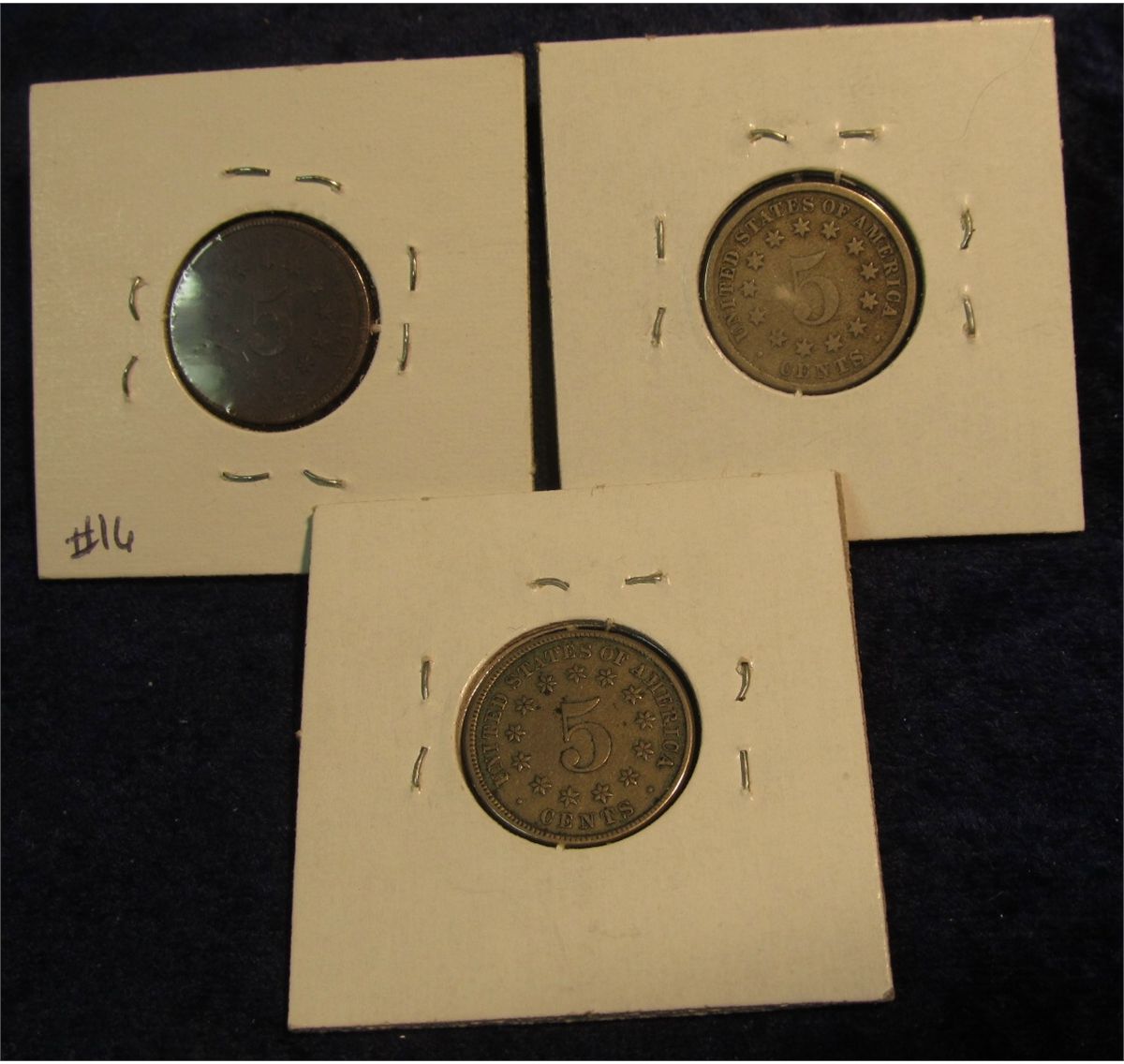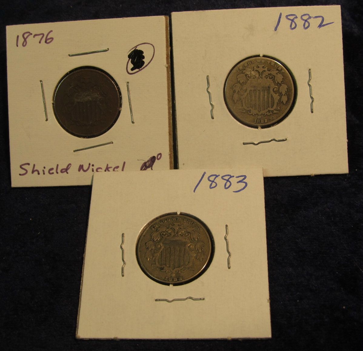 146. 1876 VG Toned, 1882 G-VG, & 1883 VF U.S. Shield Nickels. Redbook value $75.00.
