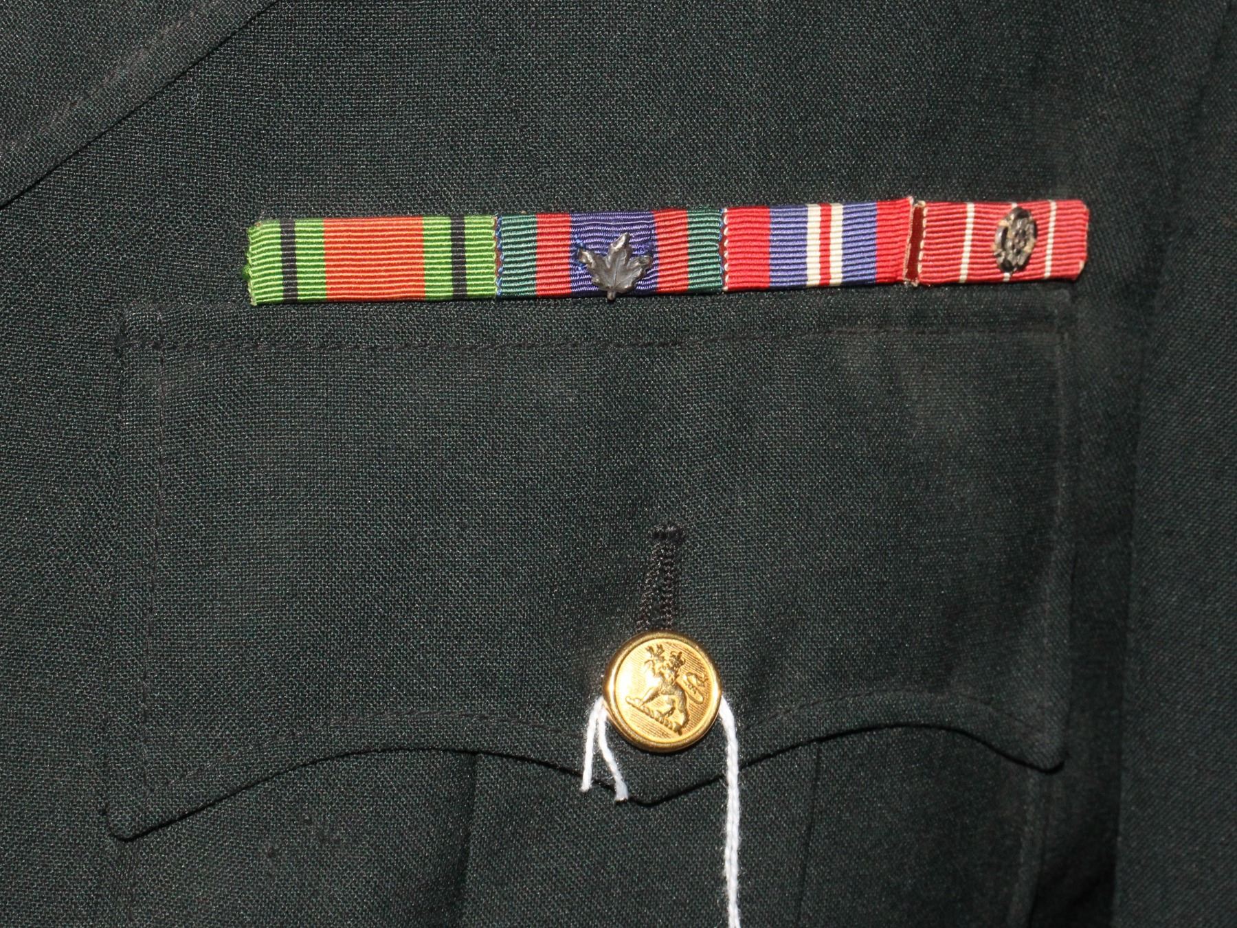 COAT MAN'S SERVICE DRESS RIFLE GREEN CANADIAN FORCES MARCH 1969- INCLUDES PANTS AND BELT, WITH WORLD WAR TWO MEDAL BAR AND CD MEDAL BAR. INCLUDES SLEEVE INSIGNIA - COLD WAR CANADIAN CANADA ALLIED FORCES UNIFORM