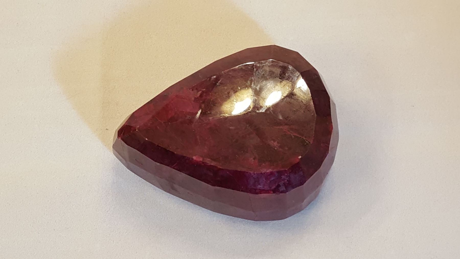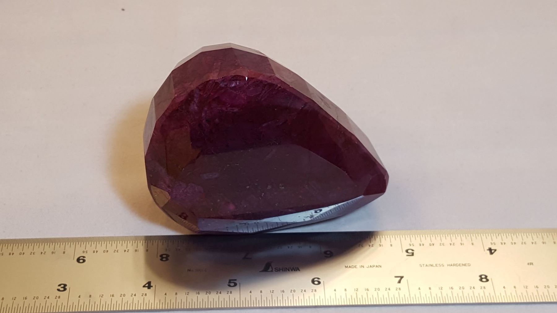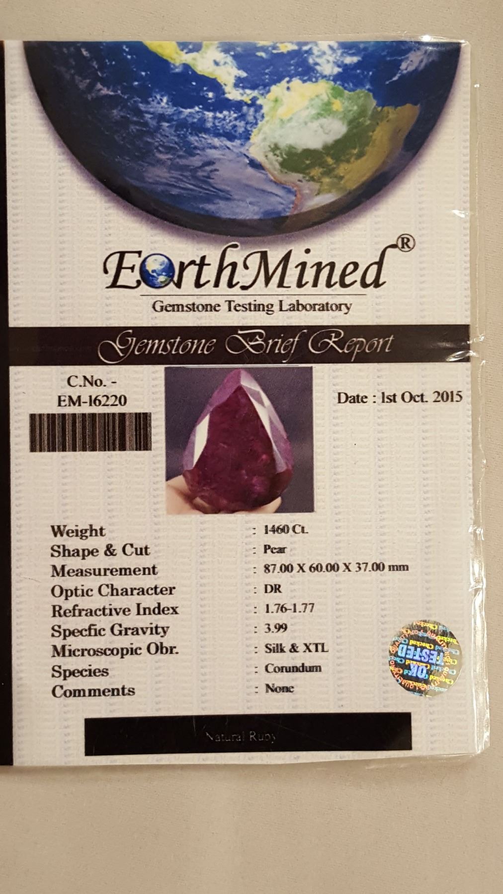 Legendary rare certified 1460.00ct museum size ruby. Fine even color saturation and hue. Natural opaque. Fine pear cut measuring 87.00 x 60.00 x 37.00 mm.