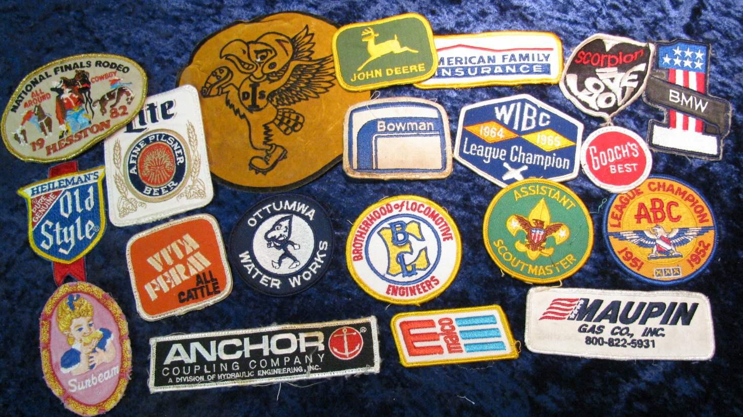 1460. (20) Different Cloth Patches. Includes "DIS" Eagle; "Scorpion I Love You"; "Lite Beer"; "BMW"; "Assistant Scoutmaster"; "Ottumwa Water Works"; "Sunbeam"; "Brotherhood of Locomotive Engineers"; "Vita Germ All Cattle"; 1951-1952 ABC League Champion"; "Maupin Gas Co., Inc."; "Gooch's Best"; "Malco"; "1982 National Finals Rodeo All Around Cowboy Hesston"; "Anchor Coupling Company"; "Heileman's Pure Genuine Old Style"; "Bowman"; "John Deere"; "American Family Insurance"; & "WIBC 1964-1964 League Champion".