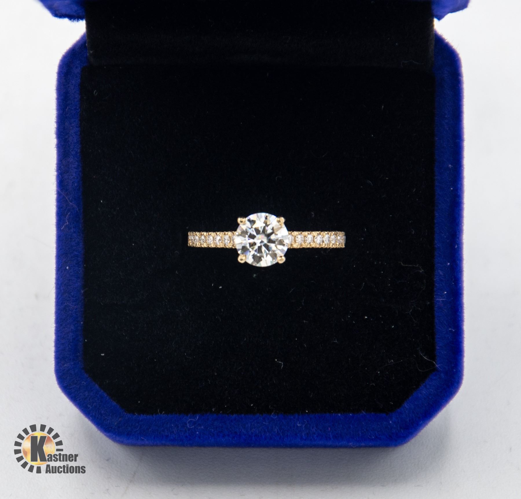 GOLD WEIGHS 2.77 GMS WITH 1.00 CT GRA CERTIFIED ROUND BRILLIANT CUT MOISSANITE STONE VVS D COLOR SET IN CENTER WITH 20 ROUND CUT CUBIC ZIRCONIA’S SET DOWN BOTH SHANKS RING SIZE 5