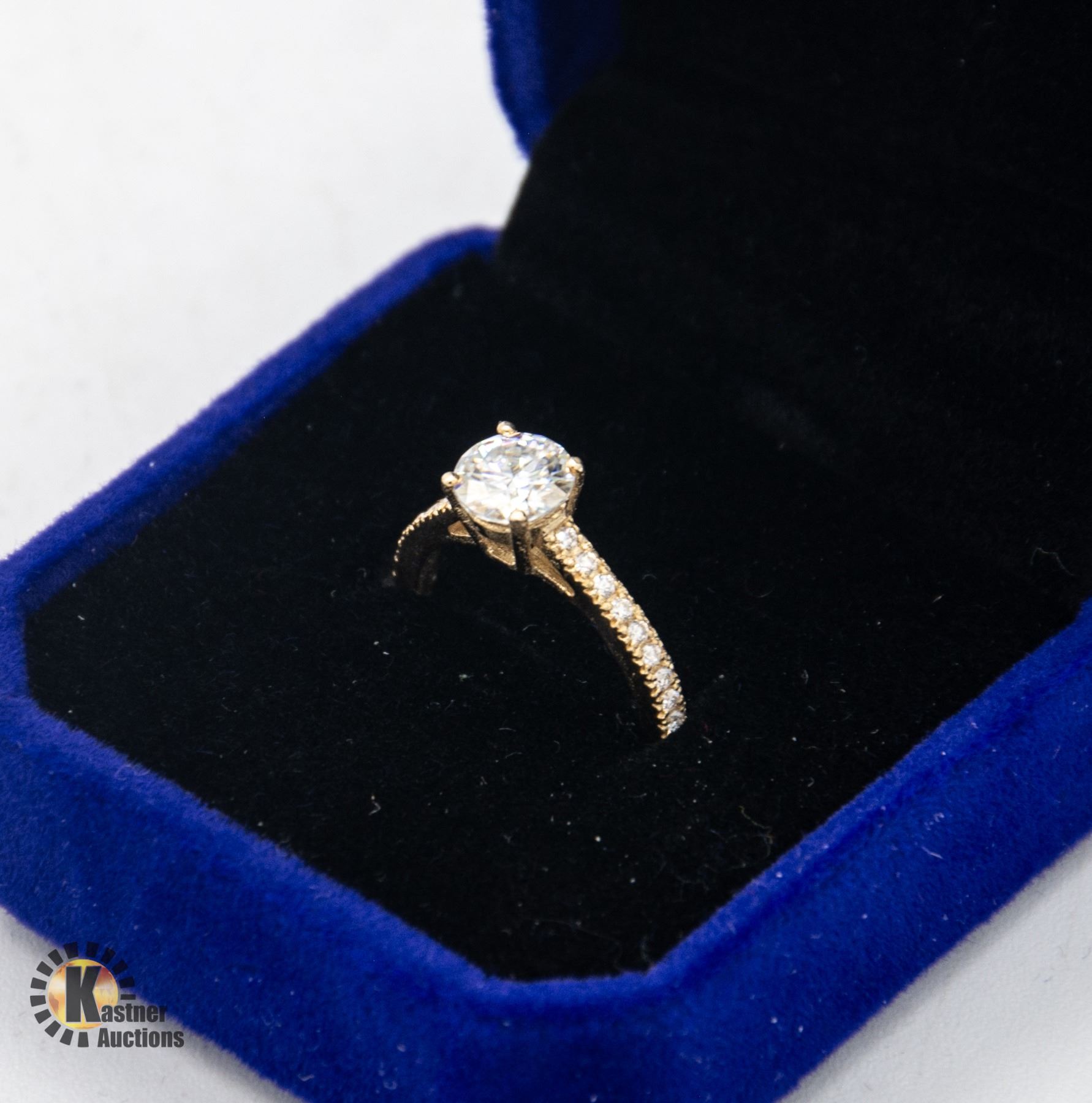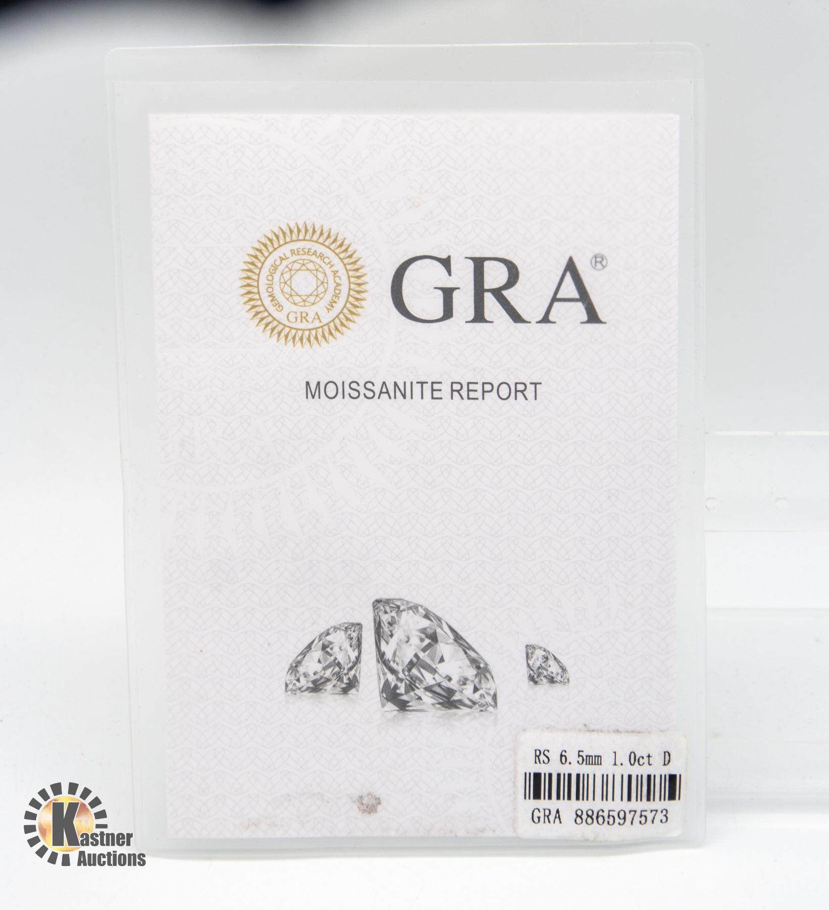 GOLD WEIGHS 2.77 GMS WITH 1.00 CT GRA CERTIFIED ROUND BRILLIANT CUT MOISSANITE STONE VVS D COLOR SET IN CENTER WITH 20 ROUND CUT CUBIC ZIRCONIA’S SET DOWN BOTH SHANKS RING SIZE 5