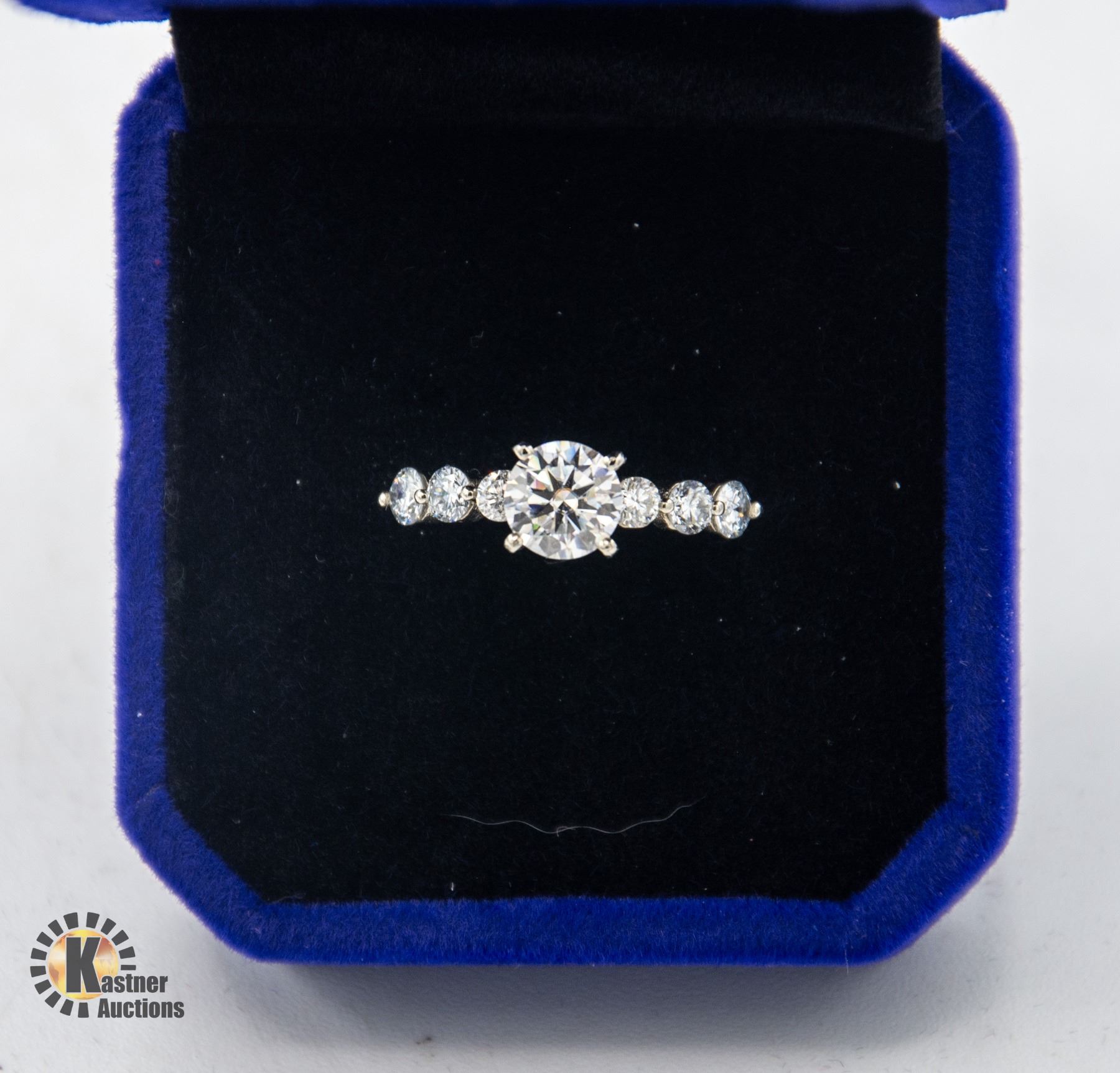 GOLD WEIGHS 2.01 GMS WITH 6 FULL CUT ROUND BRILLIANT DIAMONDS SI-I CLARITY AND HI COLOR WEIGHING0.60 CTS TW WITH 1.00 CT GRA CERTIFIED ROUND BRILLIANT CUT MOISSANITE STONE VVS D COLOR SET IN CENTER RING SIZE 6.5