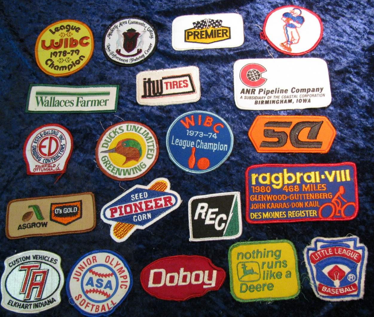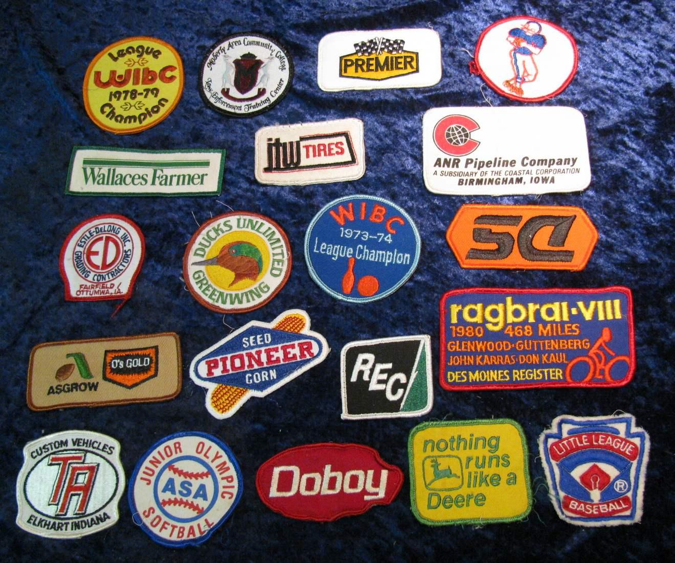 1467. (20) Different Cloth Patches. Includes "League WIBC 1978-79 Champion"; "Little League Baseball"; "Ragbrai VIII 1980 468 miles Glenwood-Guttenberg John Karras. Don Kaul Des Moines Register"; "Moberly Area Community College Law Enforcement Training Center"; & much more.