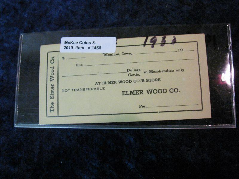 1468. Depression Script Elmer Wood Co, Moulton, Iowa Unissued