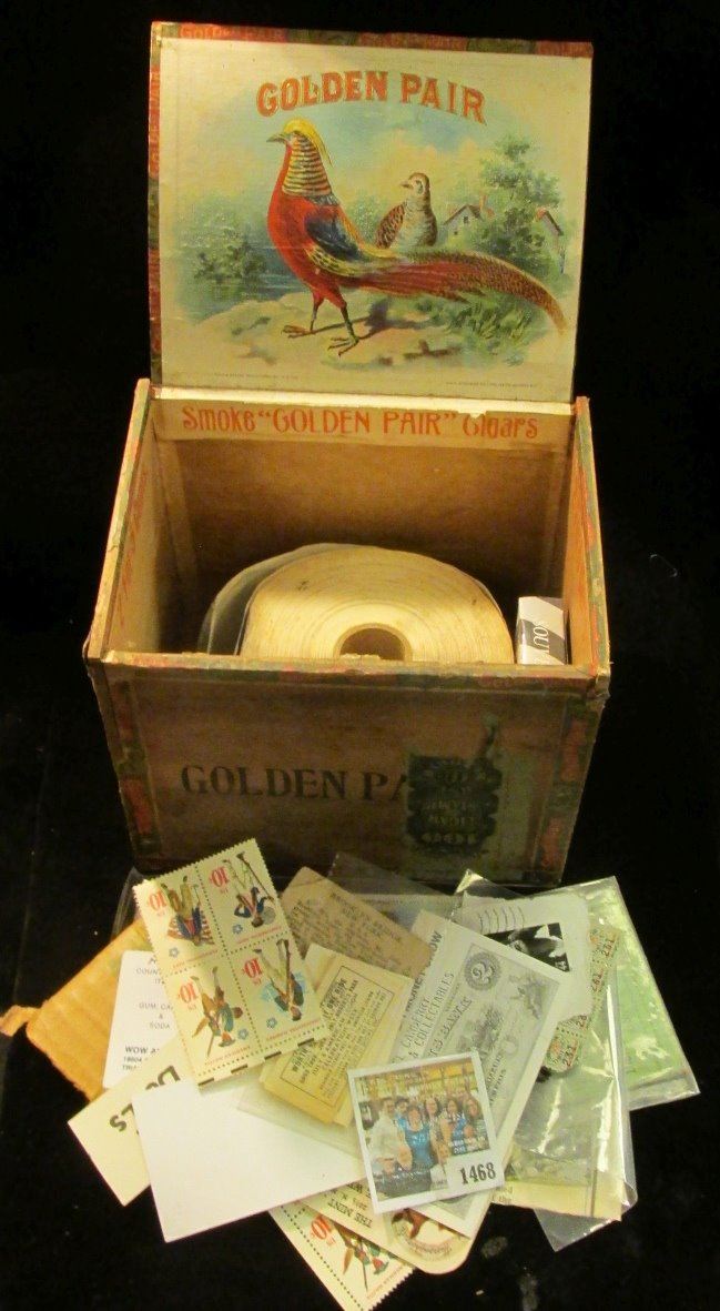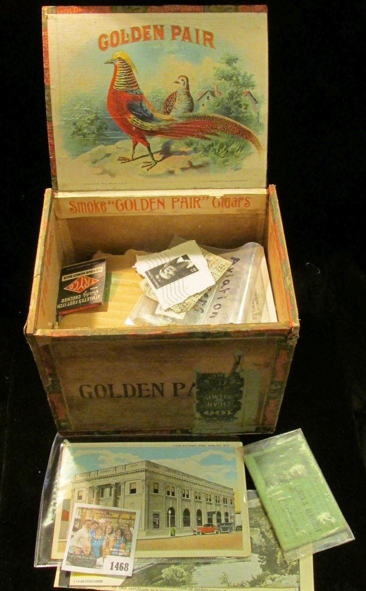 "Golden Pair Cigars" Wooden Box with various memorabilia including a roll of Harkin's Campaign stickers; Railroad Match books and boxes; stamps, Iowa souvenir playing cards, and more. Enjoy.