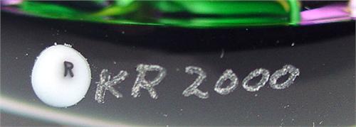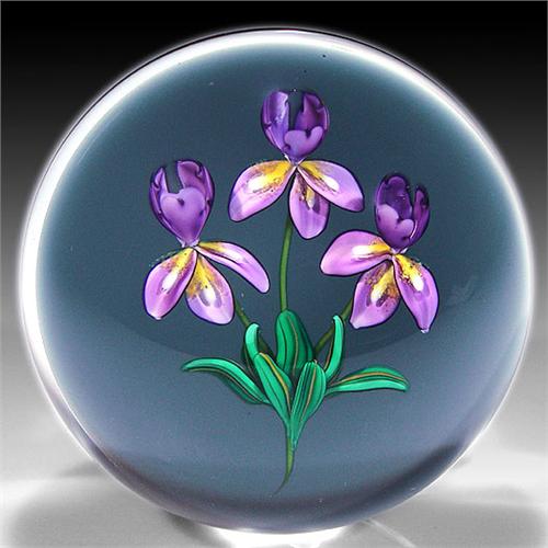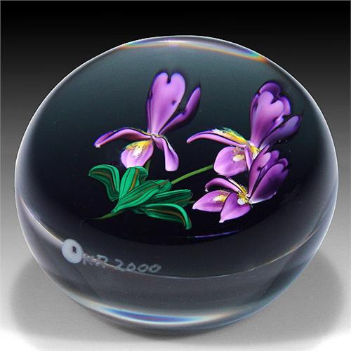 Ken Rosenfeld 2000 "Purple Iris" miniature paperweight. The piece contains three purple iris blossoms, with green leaves, on translucent sapphire ground. Signature cane. Signed/dated. Diameter 2 1/2". NO RESERVE