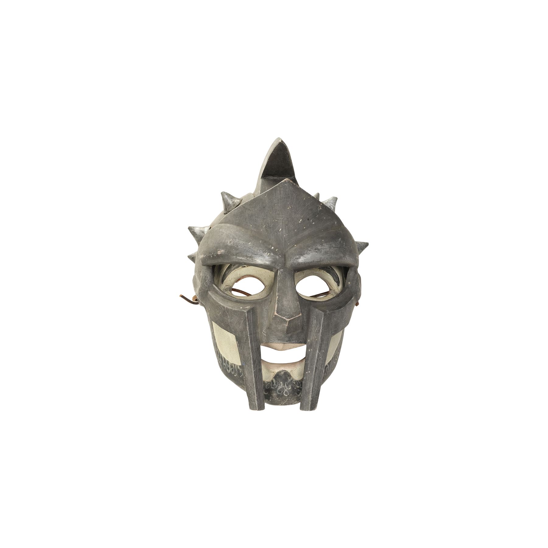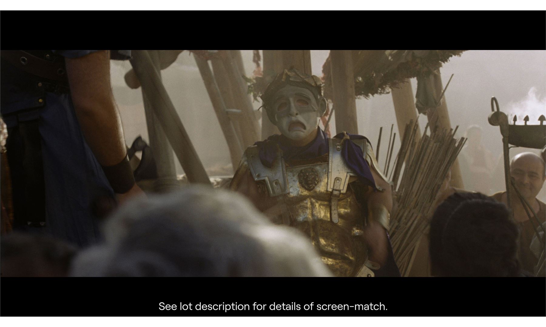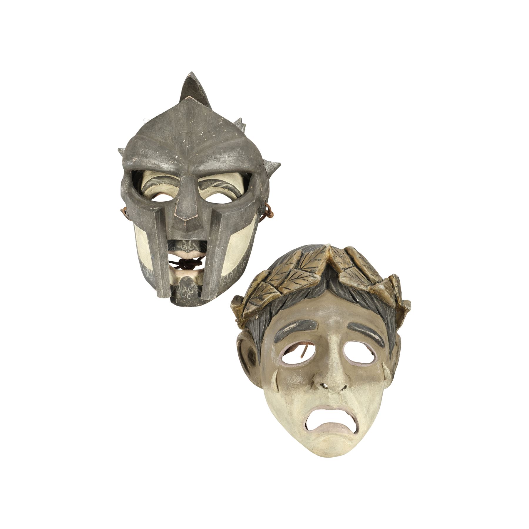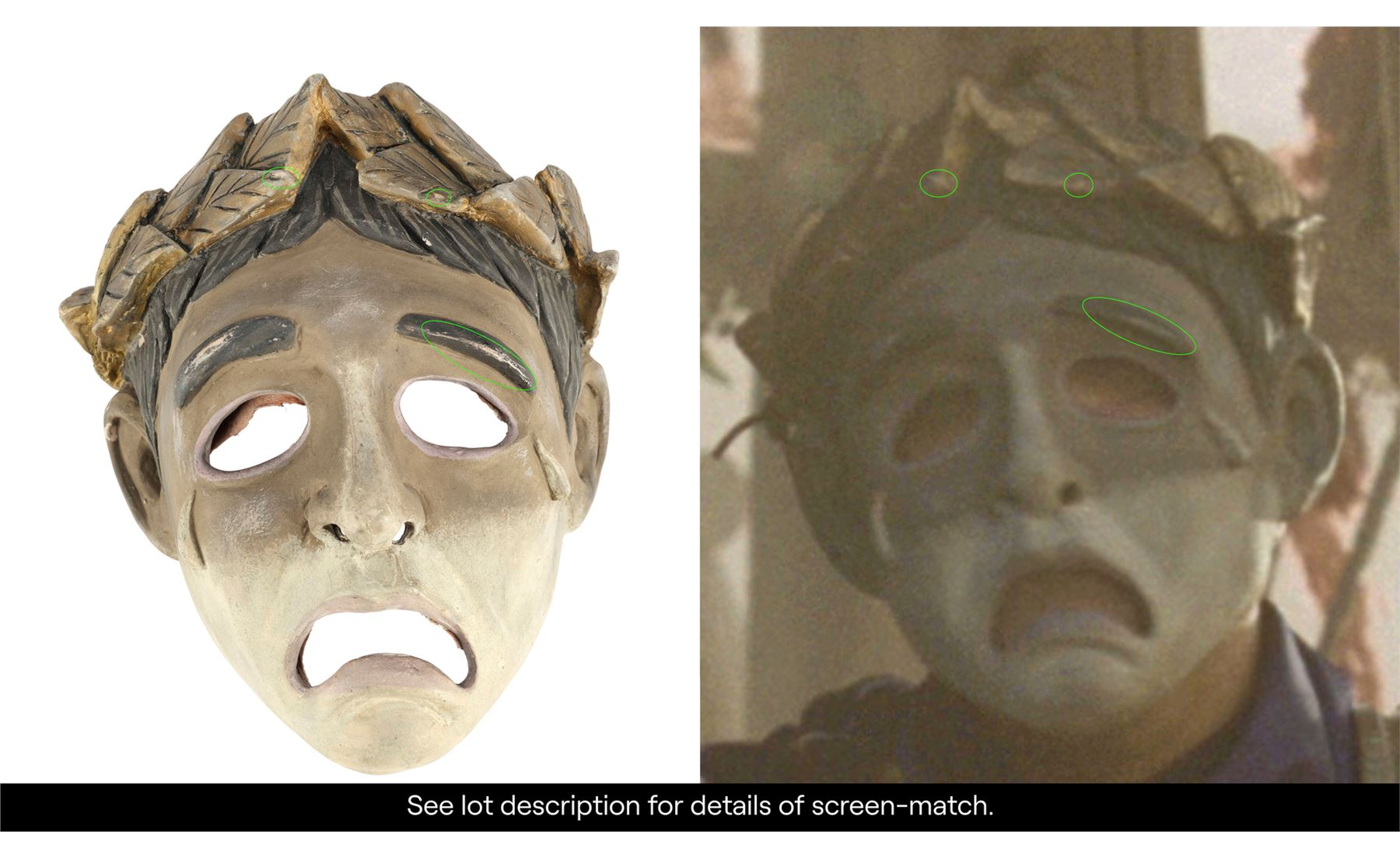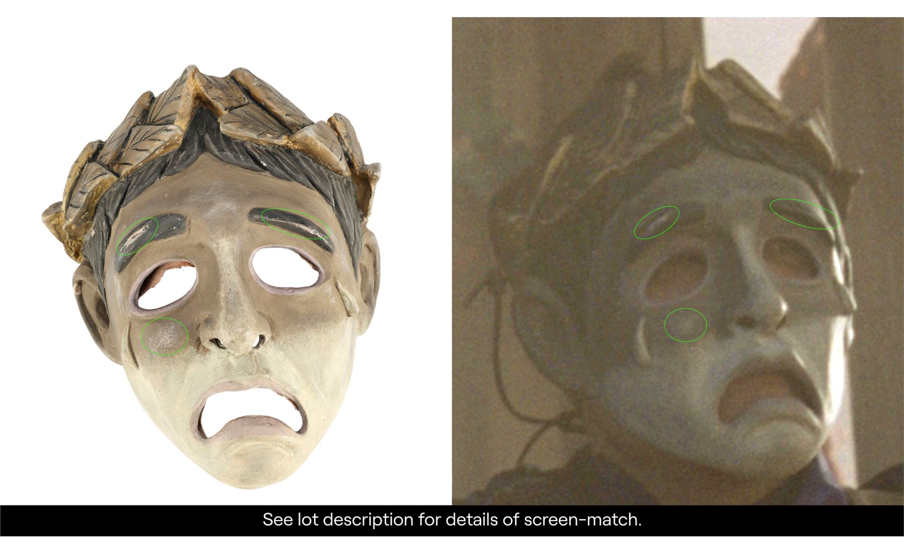 GLADIATOR (2000) - Screen-Matched Commodus Play Mask with Two Play Masks - A screen-matched Commodus play mask with two play masks from Ridley Scott's Gladiator. Intentional production distressing around the eyebrows and cheeks of the mask in Emperor Commodus' (Joaquin Phoenix) likeness screen-matches to when citizens outside the Colosseum performed a small play reenacting Maximus Decimus Meridius' (Russell Crowe) recent victories in the arena.