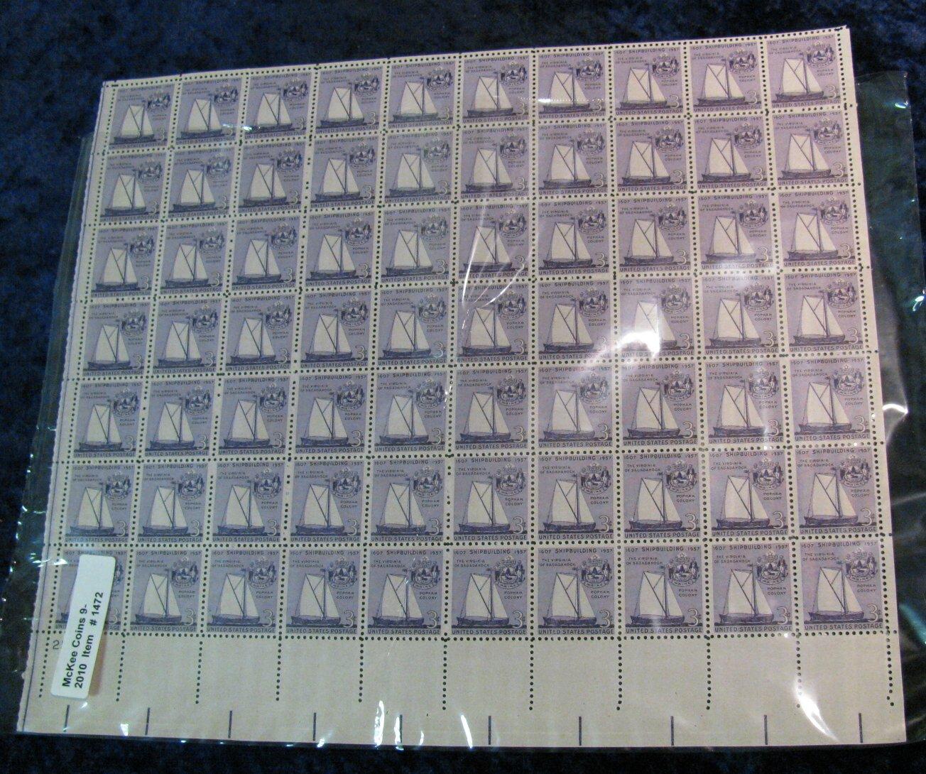 1472. Mint Sheet of "1607 Shipbuilding 1957" .03c Stamps. (face value $2.10)
