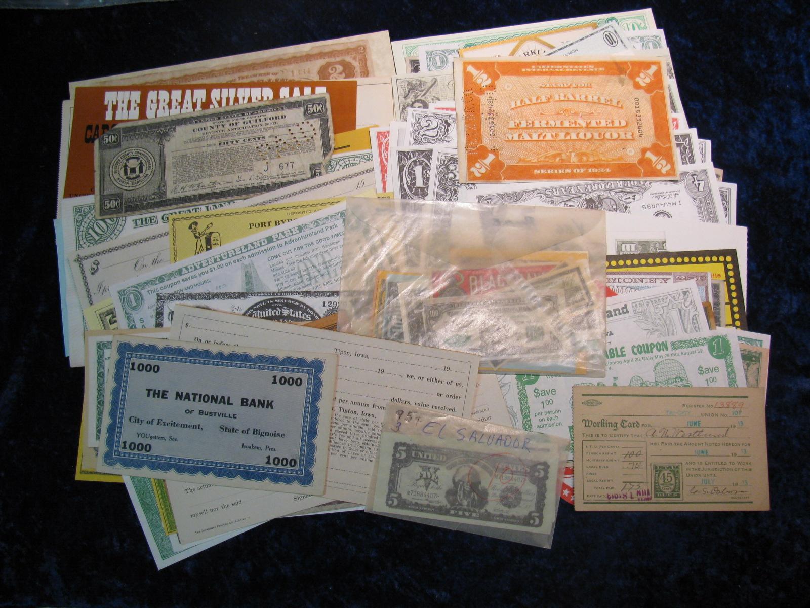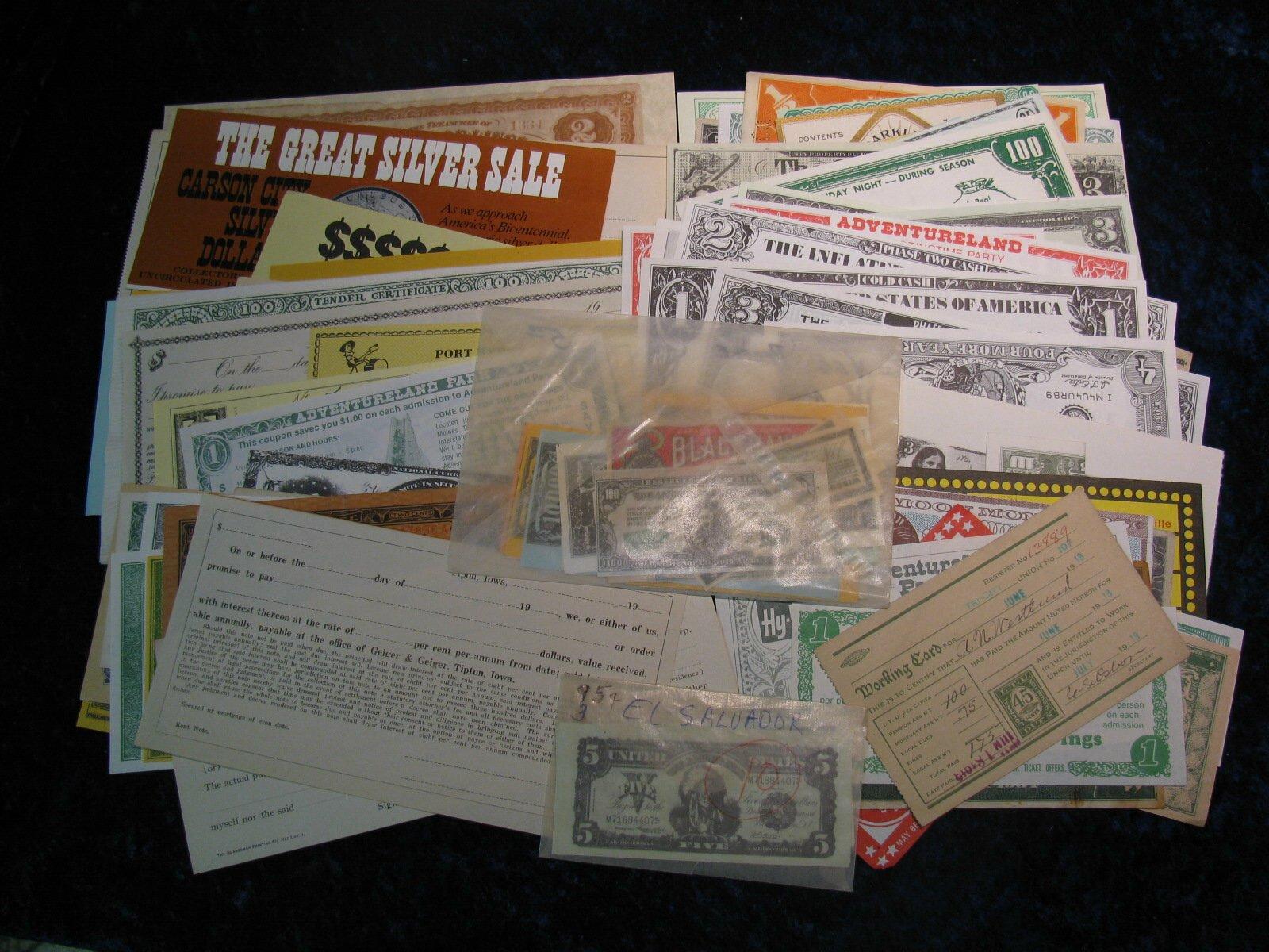 1473. Group Of Approx. 100 Assorted Notes, Funny Money, Depression, Advertising, Tax, Foreign, etc…