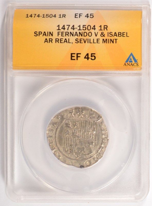 1474-1504 SILVER 1 REAL SPAIN FERNANDO V 7 ISABEL, ANACS EF45, SCARCE