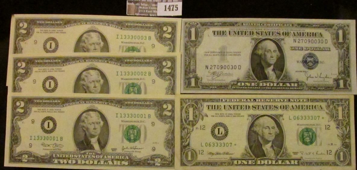 Series Of 1935-C One Dollar Blue Seal Silver Certificate, Three Crisp, Consecutive Two Dollar Notes, & 1995 One Dollar Star Note.