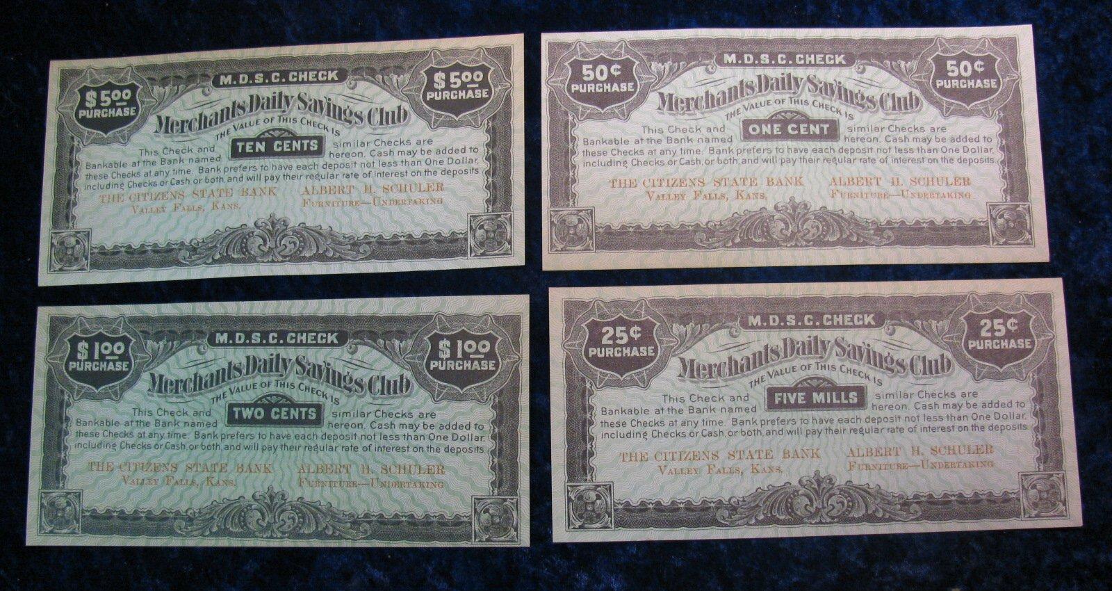 1475. Set of 4 M.D.S.C. Checks Valley Falls,Kansas,1930's Depression Script.