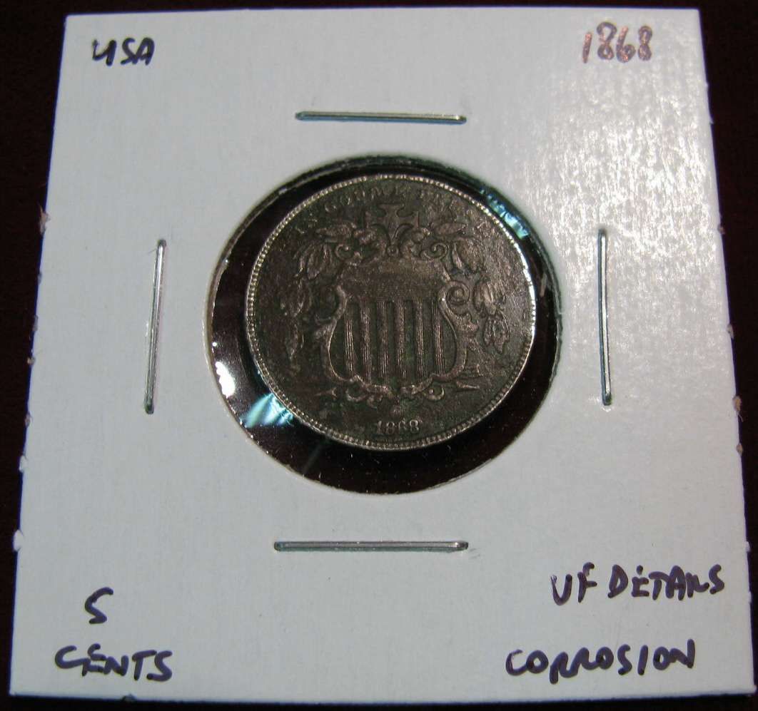 1477. 1868 US Shield Nickel. VF Detail Corrosion.