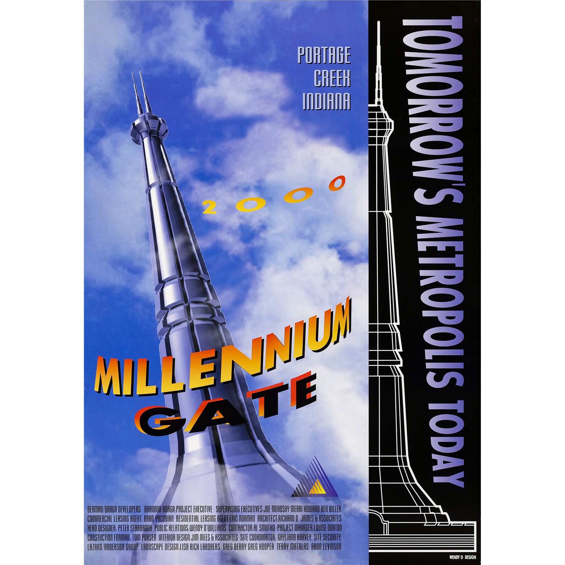 This poster, which comes from the collection of celebrated Star Trek franchise artists and advisors Michael and Denise Okuda, is color-printed on poster paper and depicts the gate along with the words "Millennium Gate," "Portage Creek Indiana," "2000," and "Tomorrow's Metropolis Today." It exhibits minor edge wear from age. Dimensions: 19" x 27" (48.5 cm x 68.75 cm)Though their long and celebrated careers in the Star Trek world began in features, Michael and Denise Okuda established themselves as franchise legends while working on Star Trek: The Next Generation. Michael became art supervisor on TNG, while Denise came on as a scenic artist during Deep Space Nine, roles they would continue to perform through Voyager, Enterprise, and the Next Generation films. Married in 1993, the Okudas are known as the driving forces behind the development of many of the now-iconic 24th-century technologies seen throughout the series, including the famous "Okudagrams" they created for the LCARS (Library Computer Access and Retrieval System) interfaces . Propstore is proud to present a selection of key memorabilia from the personal collection of one of the franchise's most important creative teams to the public for the first time.