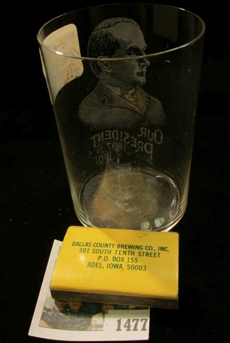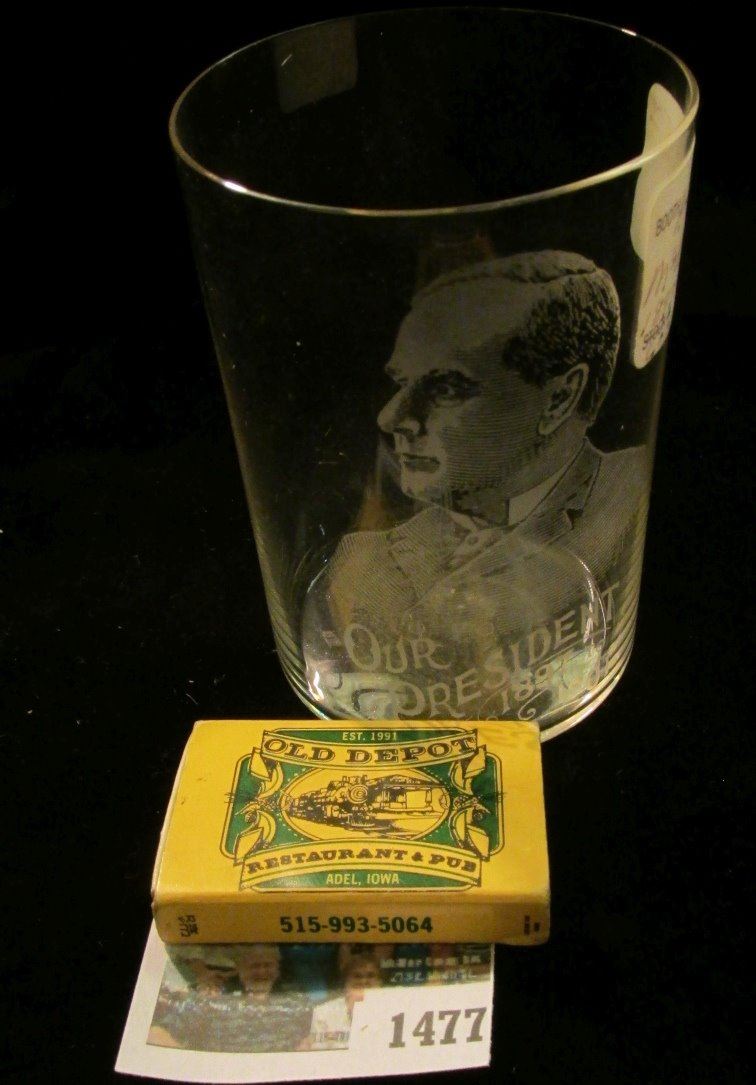 "Old Depot Restaurant & Pub Adel, Iowa" Match Box; & President McKinley Etched Crystal Glass "Our President 1897 To 1901" Very Good condition.