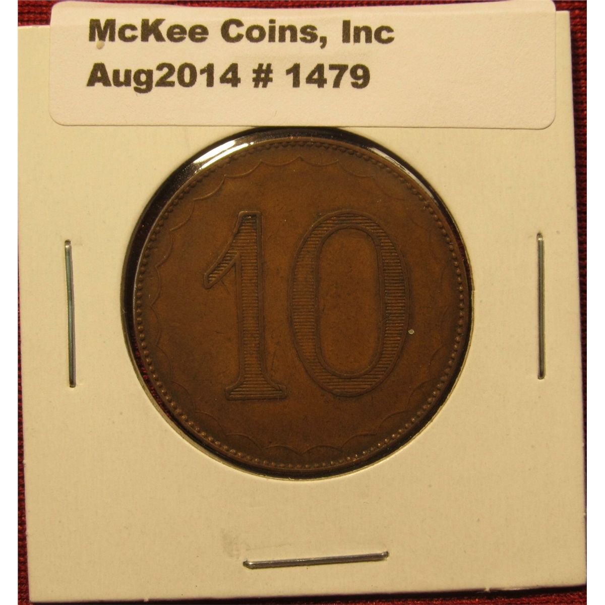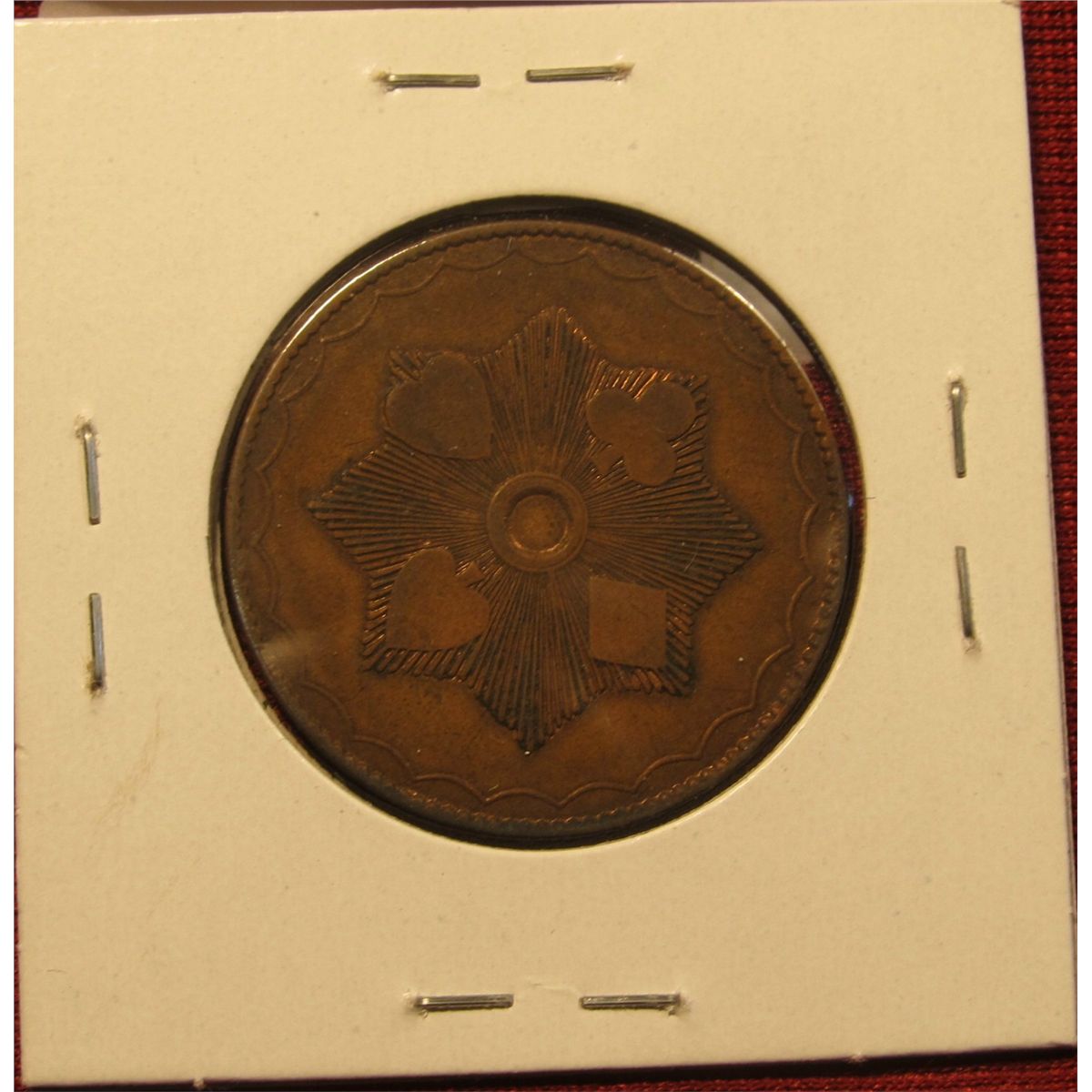 1479. Old bronze gaming token with “10” on one side and the four suits of cards on the other