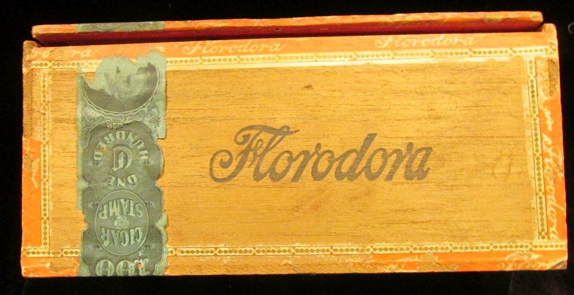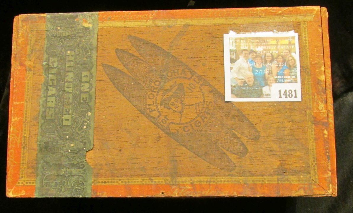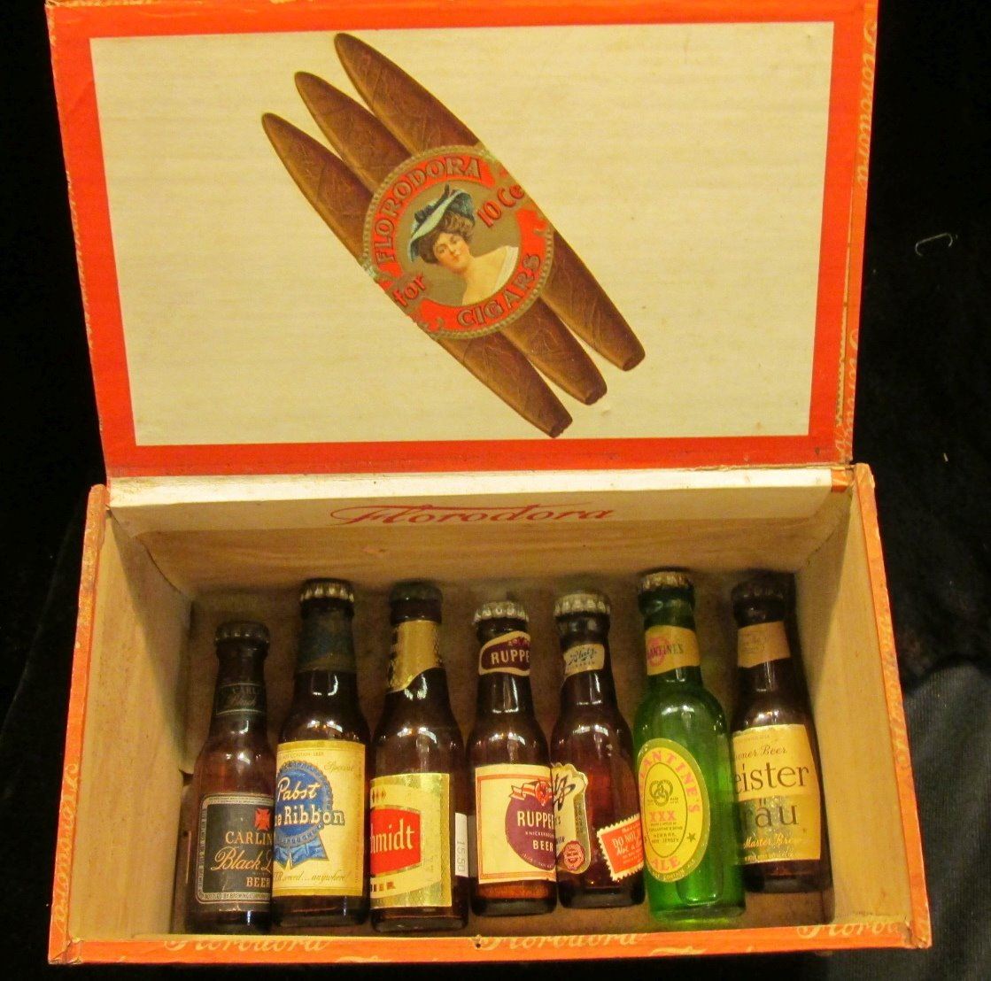"Florodora for 10 Cent Cigars" Wooden Cigar Box containing numerous miniature Whiskey Bottles. If shipped, contents will be emptied.