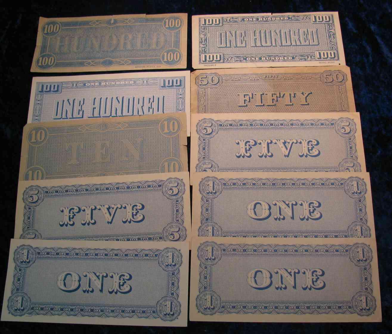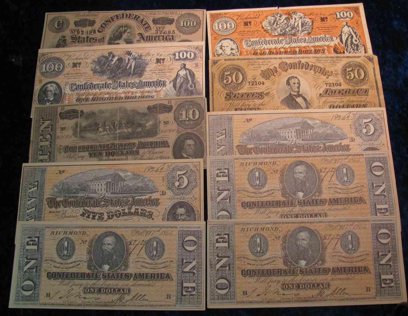 1482. (10) Assorted Confederate States Facsmile Notes, $1, $5, $10, $50 & $100