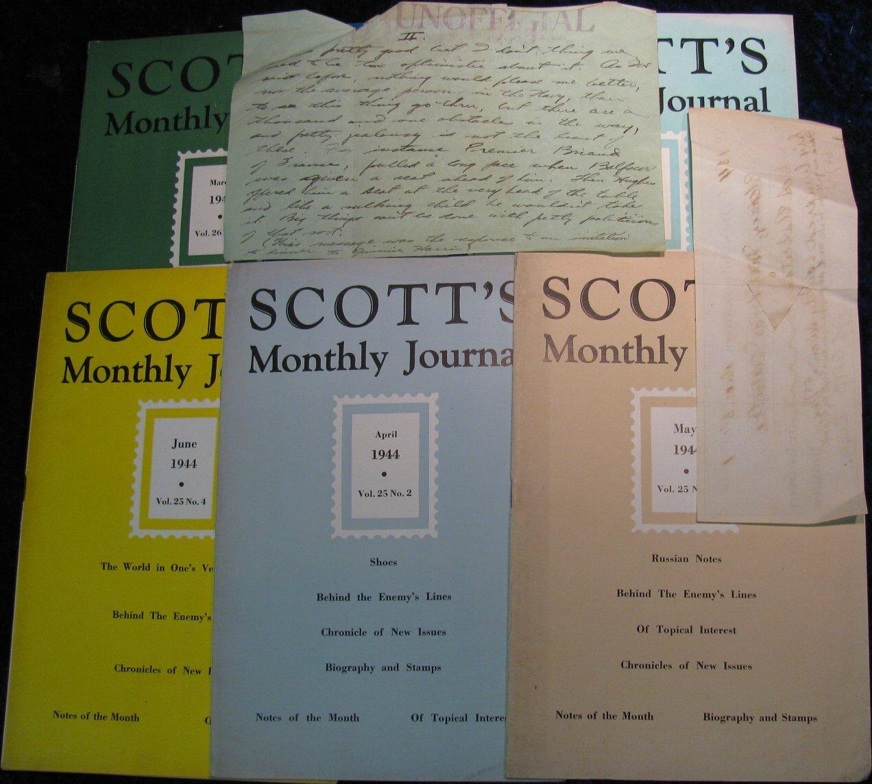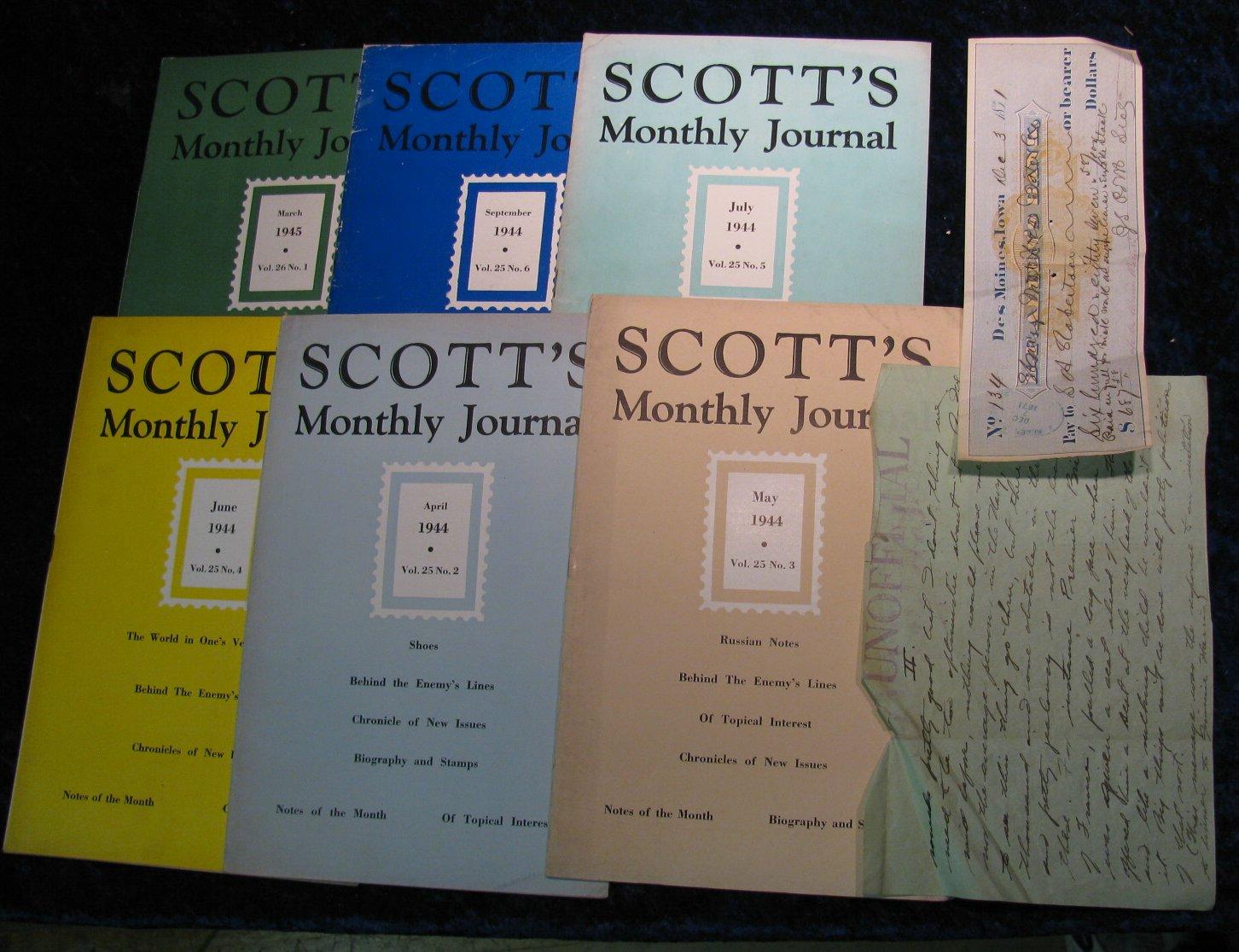 1482. Military Stamped Unofficial Censored War Correspondence Letter; (6) WW II Scott Stamp Catalogs; & 1871 Cancelled Check from Des Moines, Ia.