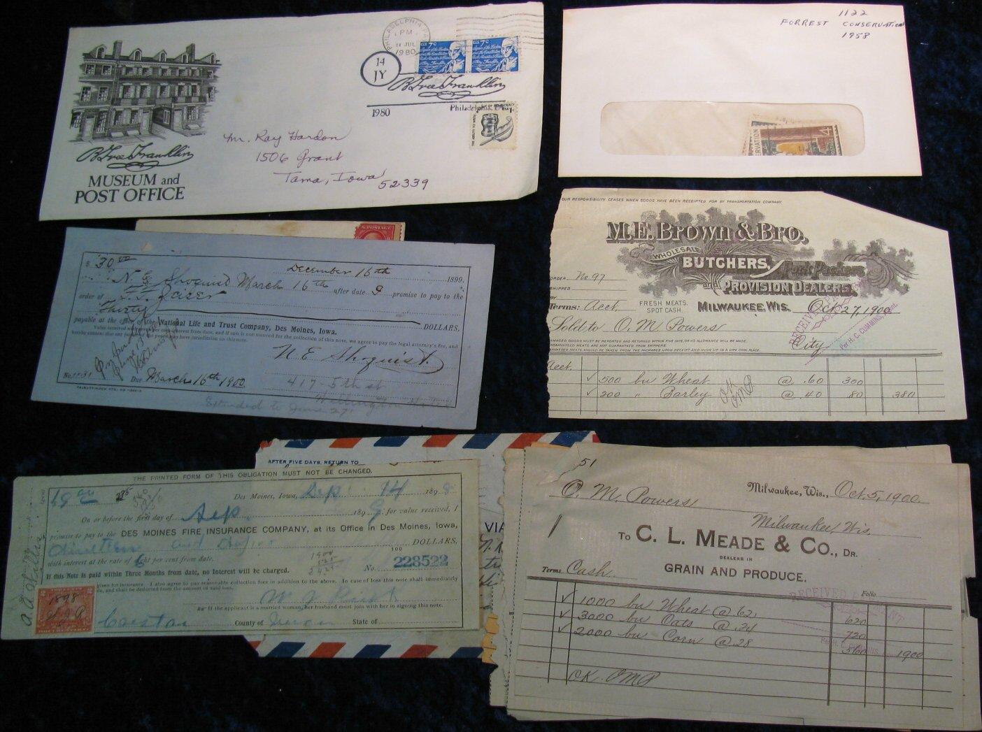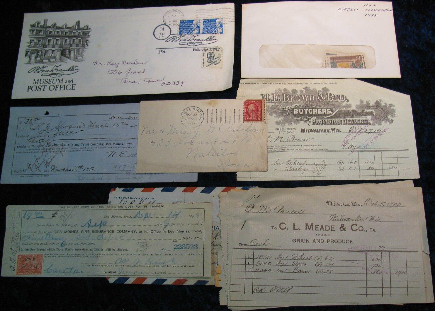1485. 1943 World War II Cover; 1923 Cover from Vinton, Ia.; Group of 1900 Produce Invoices; 1980 Fancy Stamped Cover; pair of 1899 Invoices; & several Scott No. 1122 Stamps.