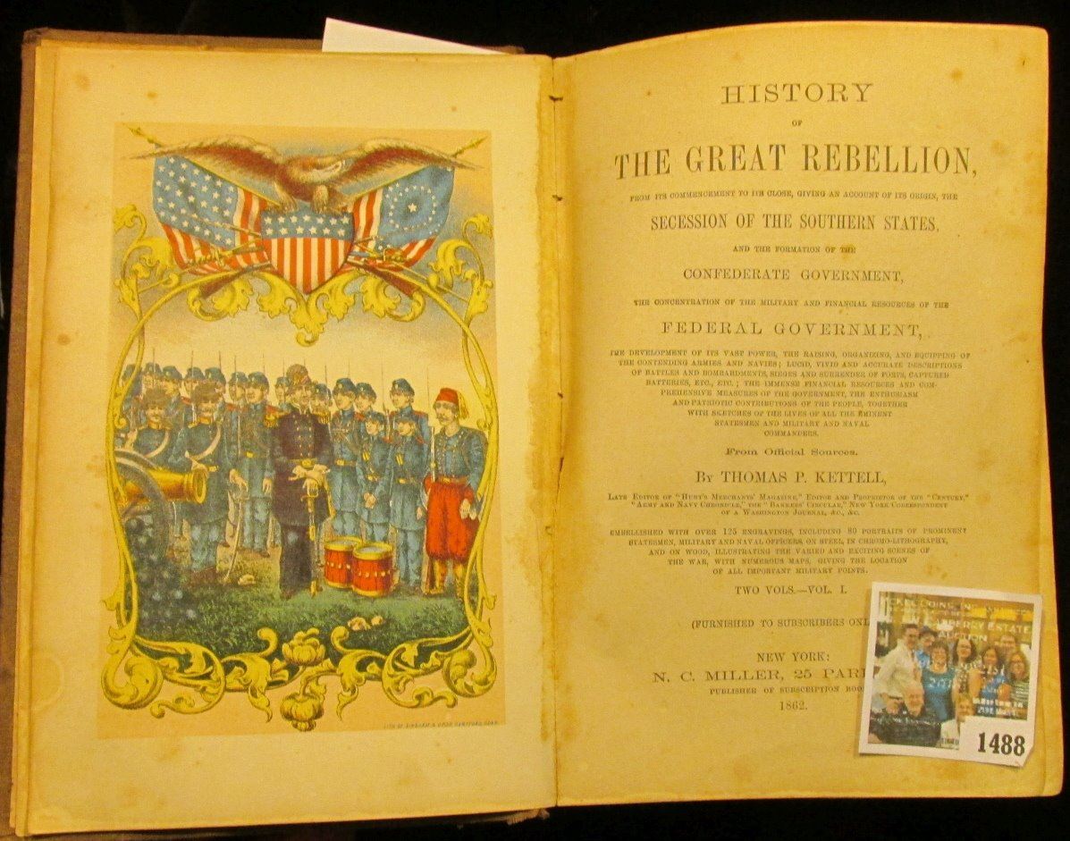 "History of the Great Rebellion from its Commencement to its Close, giving an account of its origin, The Secession of the Southern States and the Formation of the Confederate Government…", " Volume I, by Thomas P. Kettell. "entered according to Act of Congress, in the year 1862. (Curious how they knew what the Close was going to be). Even has a couple of leaves pressed inside.