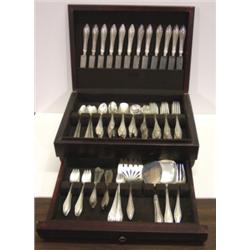 149 PCS. OF TOWLE STERLING FLATWARE. In the Mary Chilton, 1912 pattern. Monogrammed. Consists of 12 dinner knives (8 3/4” L), 12 forks (7 3/4” L), 12 dessert-luncheon forks (7.25” L), 11 salad forks (6.25” L), 12 ice cream spoons (5 5/8” L), 12 soup spoons (5 5/8” L), 13 tea spoons (5 ¾” 5 o’clock), 11 sugar spoons (5 7/8” L), 12 iced tea spoons (8 1/8” L), 14 butter spreaders (6” L), 12 3-pronged spoons (5 5/8” L), 12 cocktail forks (6” L), one 5-pronged server (8 3/8” L), one server (8 7/8” L), one fork (7 ¾” L), & one ladle (8 7/8” L). Set is in wooden flatware case.