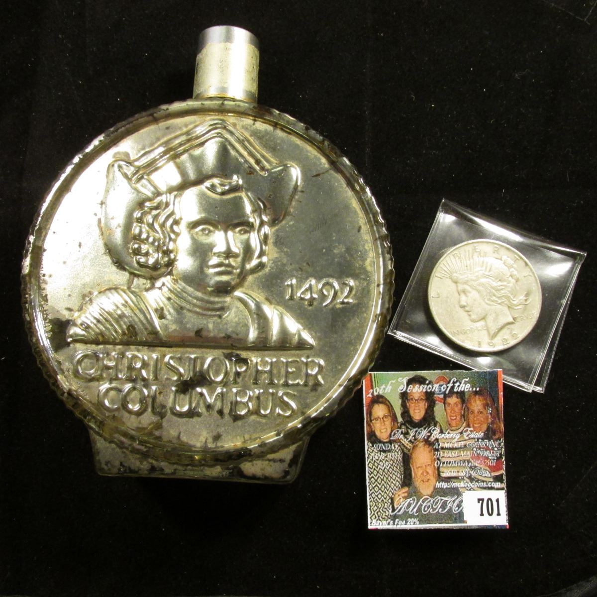 "1492 Christopher Columbus" Bottle dated 1976 on the base; & 1922 P U.S. Peace Silver Dollar, VF.