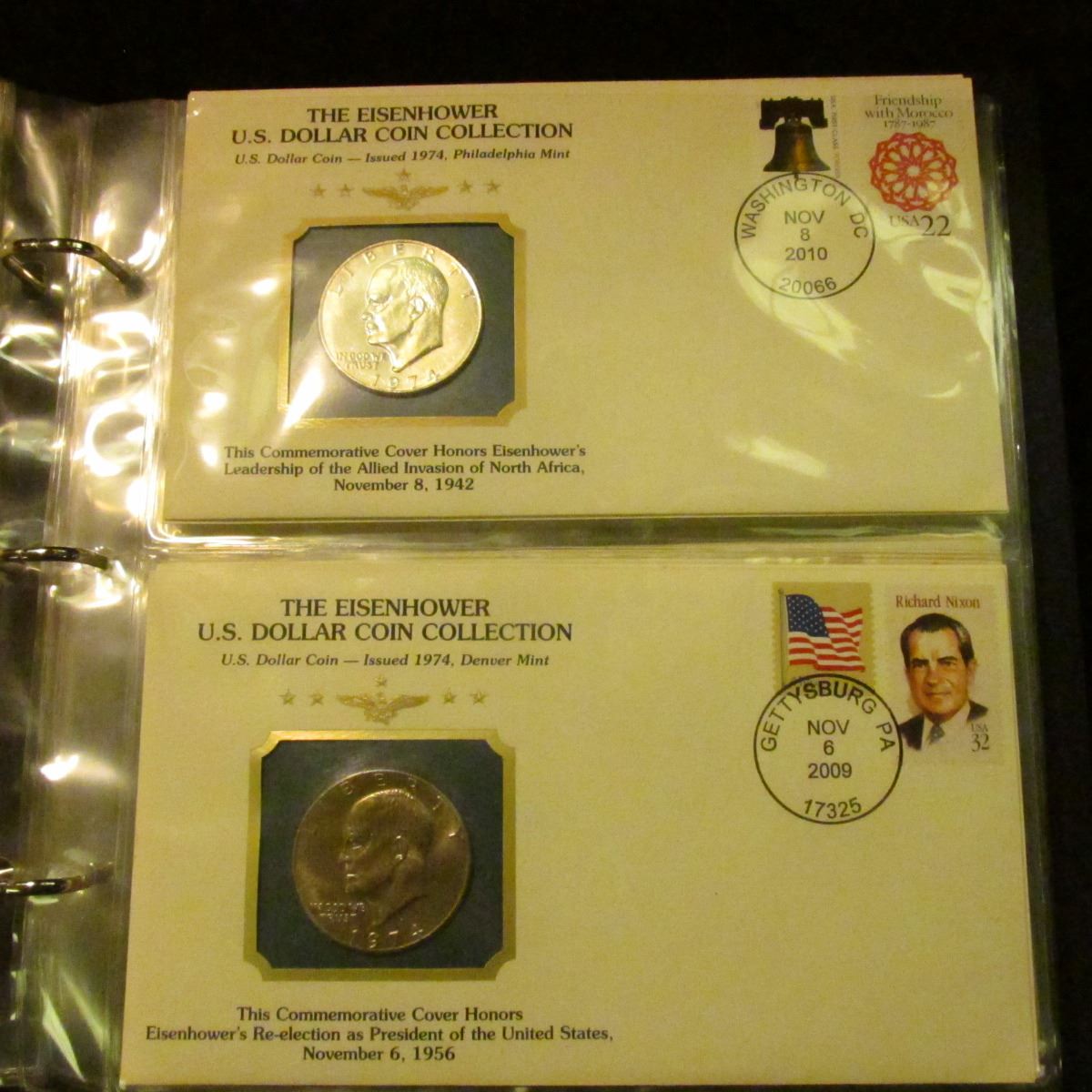 "The Eisenhower U.S. Dollar Coin Collection", by Postal Commemorative Society, all stamped, postmarked Covers with literature. Stored in an attractive album.