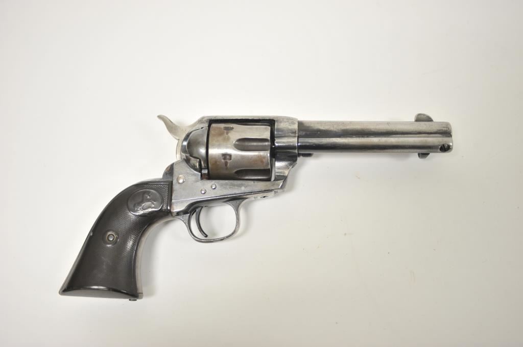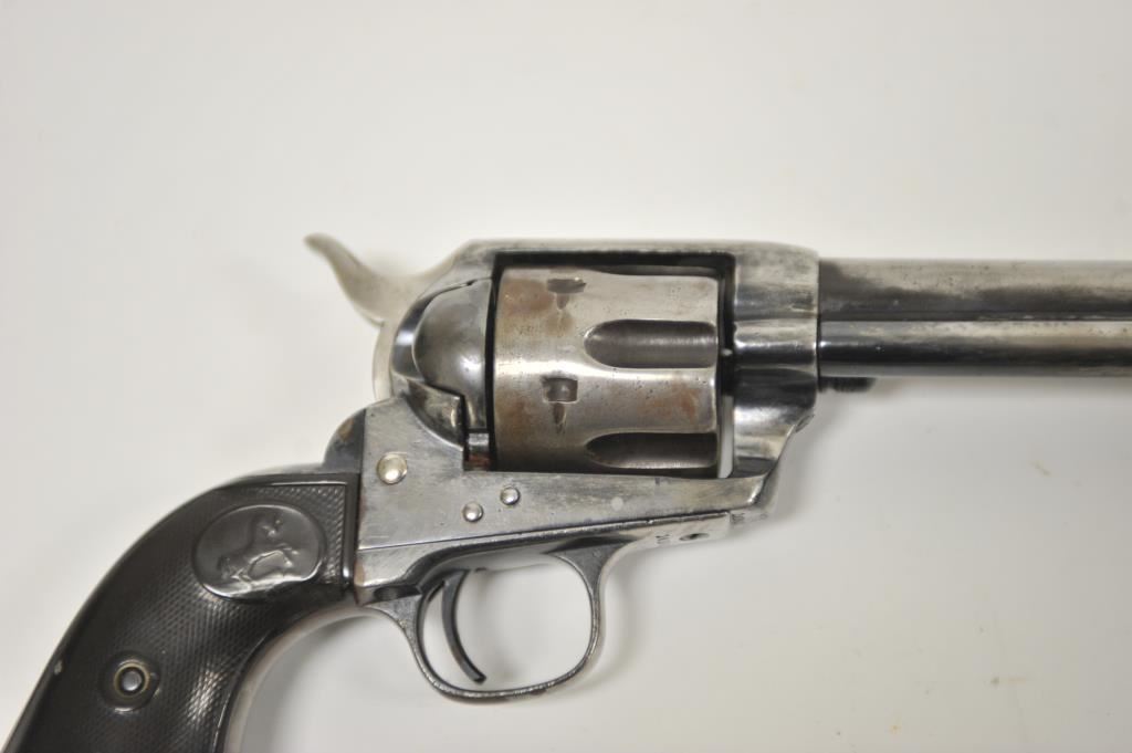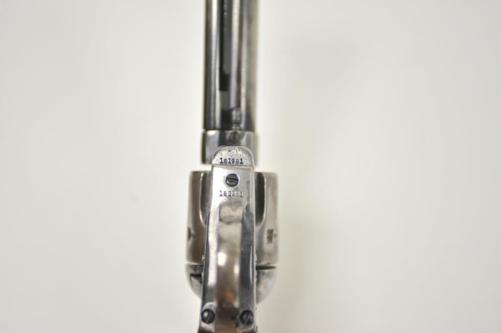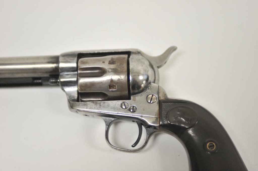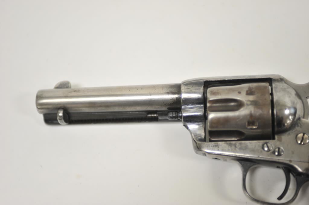 Colt Blackpowder 1st Generation Single Action Army revolver in .44-40 caliber with a 4 ¾” barrel, S/N 101981 made about 1882-83. Traces of worn old re-blued finish with minor pitting and erosion. Matching numbers and visible markings. Front sight shaved slightly. The grips are worn. Fair bore and the action is good. Ejector rod probably later colt replaced part as not a perfect fit. A hard used and carried early Colt frontier six shooter. Out of an estate and never lettered (Good range). (Antique) Est.: $1500-$3000