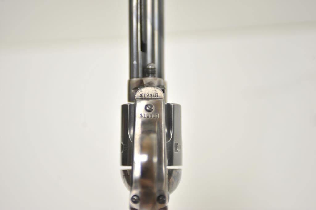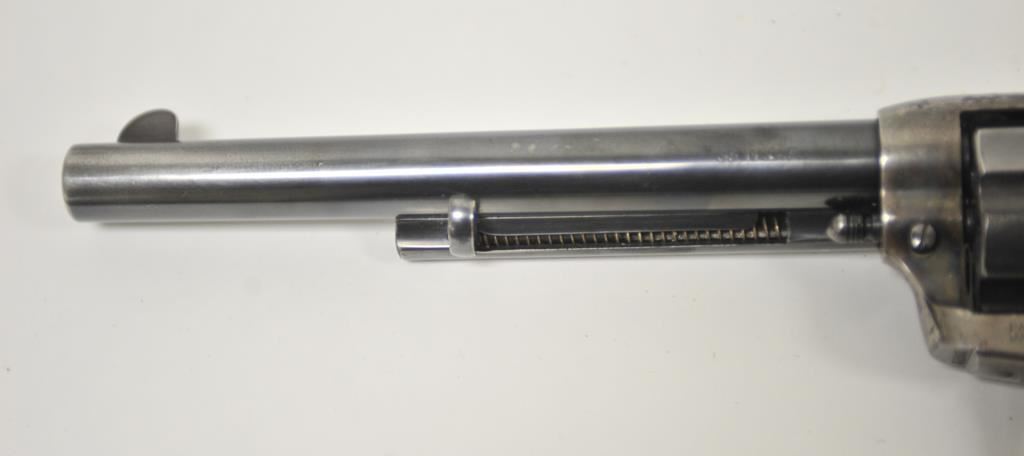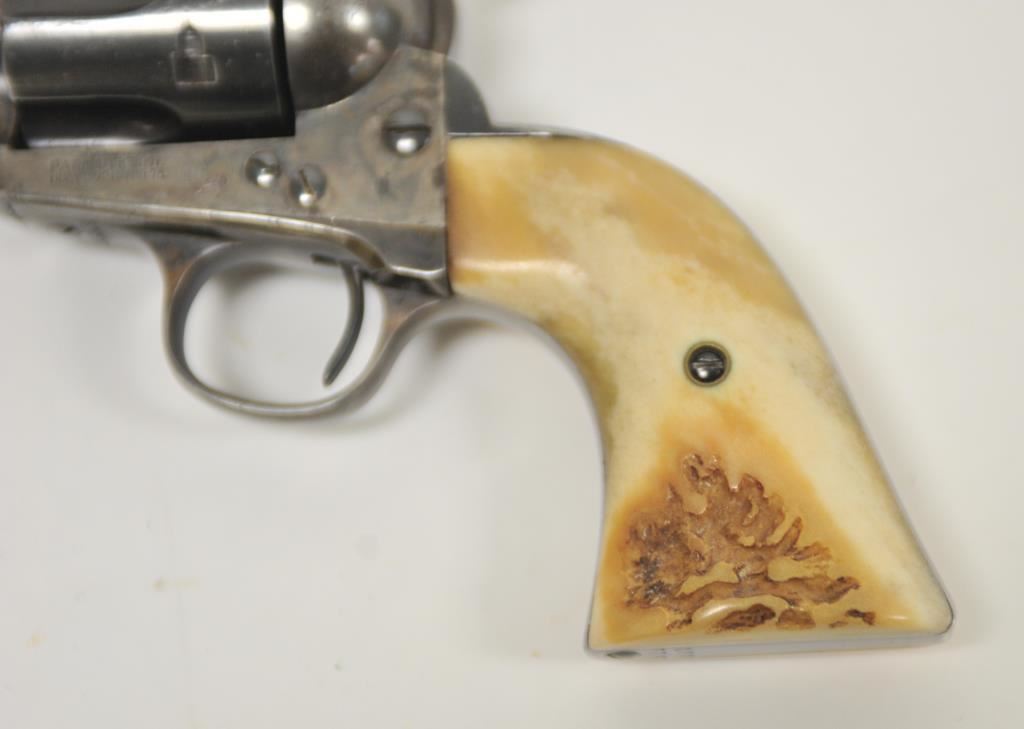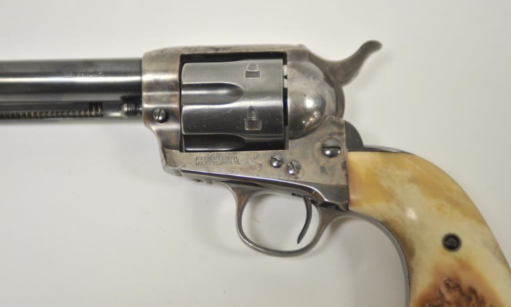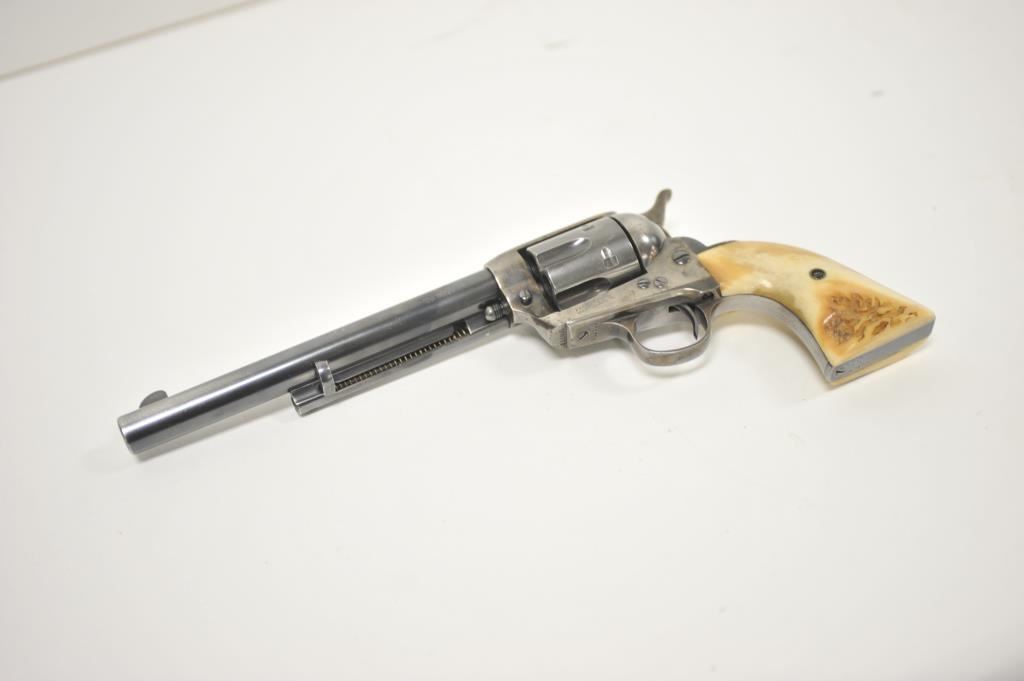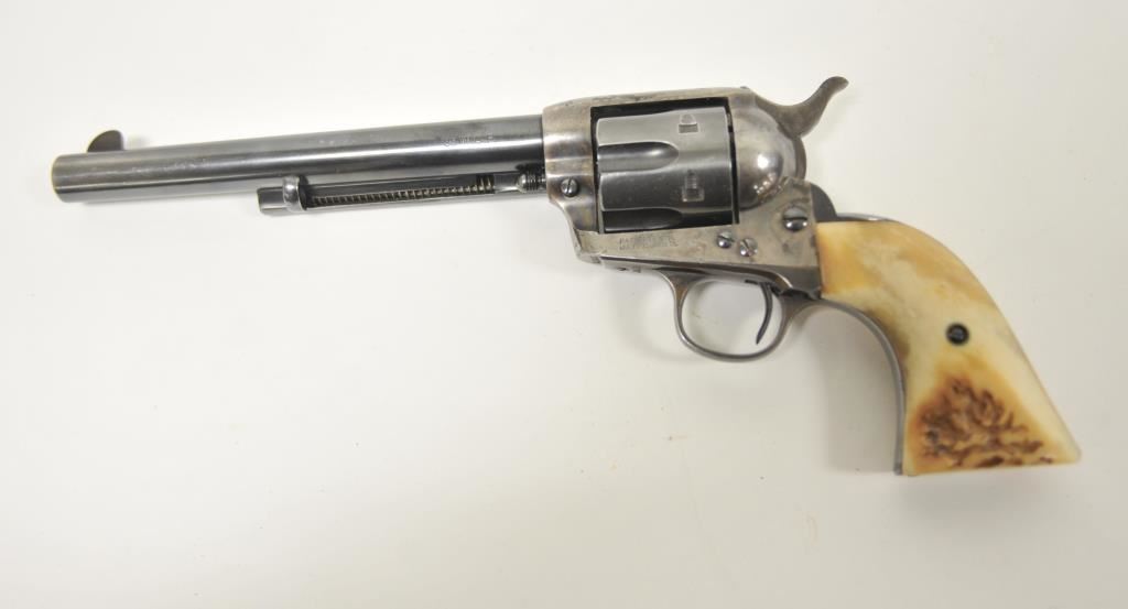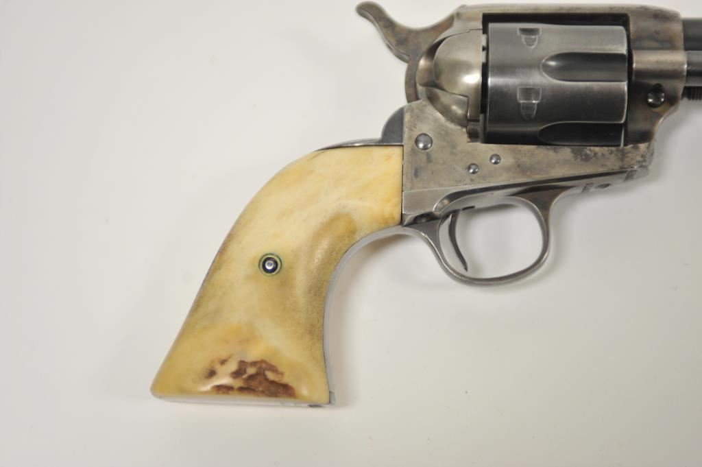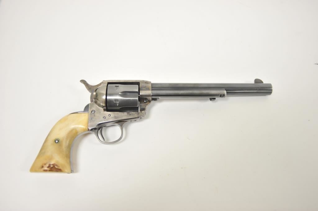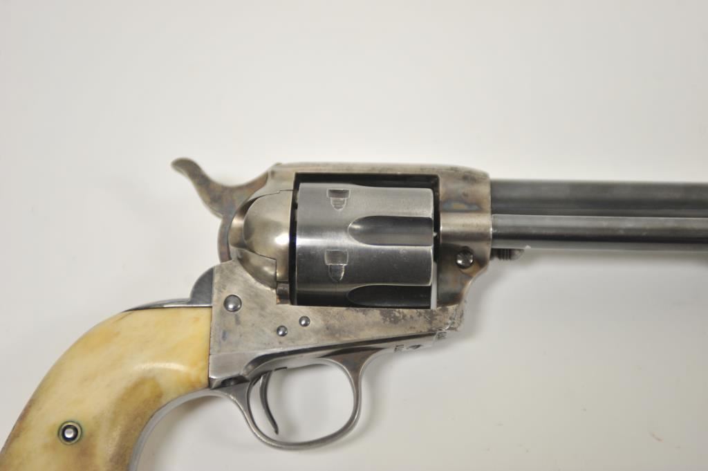 Colt Single Action Army revolver, 1st generation, .38-40 caliber with 7 ½” barrel, blue and case colored finish, period yellow stag grips, S/N 318307. (Collectors tag on guard reads “July 28,1911, blue, shipped Okla. City, Oklahoma.”) Not confirmed. 75%-85% original blue on the barrel and cylinder drifting at muzzle from carry in holster. Index line on the cylinder and loss of blue on the high points. 30%-50% case showing erosion and cleaning probably from holster also. The straps show 50% thinning blue at the gripping areas. The hammer shows like amount of case to the frame. Pristine interior and very bright bore. Tight action. The front sight is its full dimensions with feathering or polish around sight showing strong. The grips are well aged and of same era. Minor erosion and pinprick pitting. Once again likely holster damage and moisture. A nice 1st gen that may letter to OK. (C&R/PPT) Est.: $2750-$5500