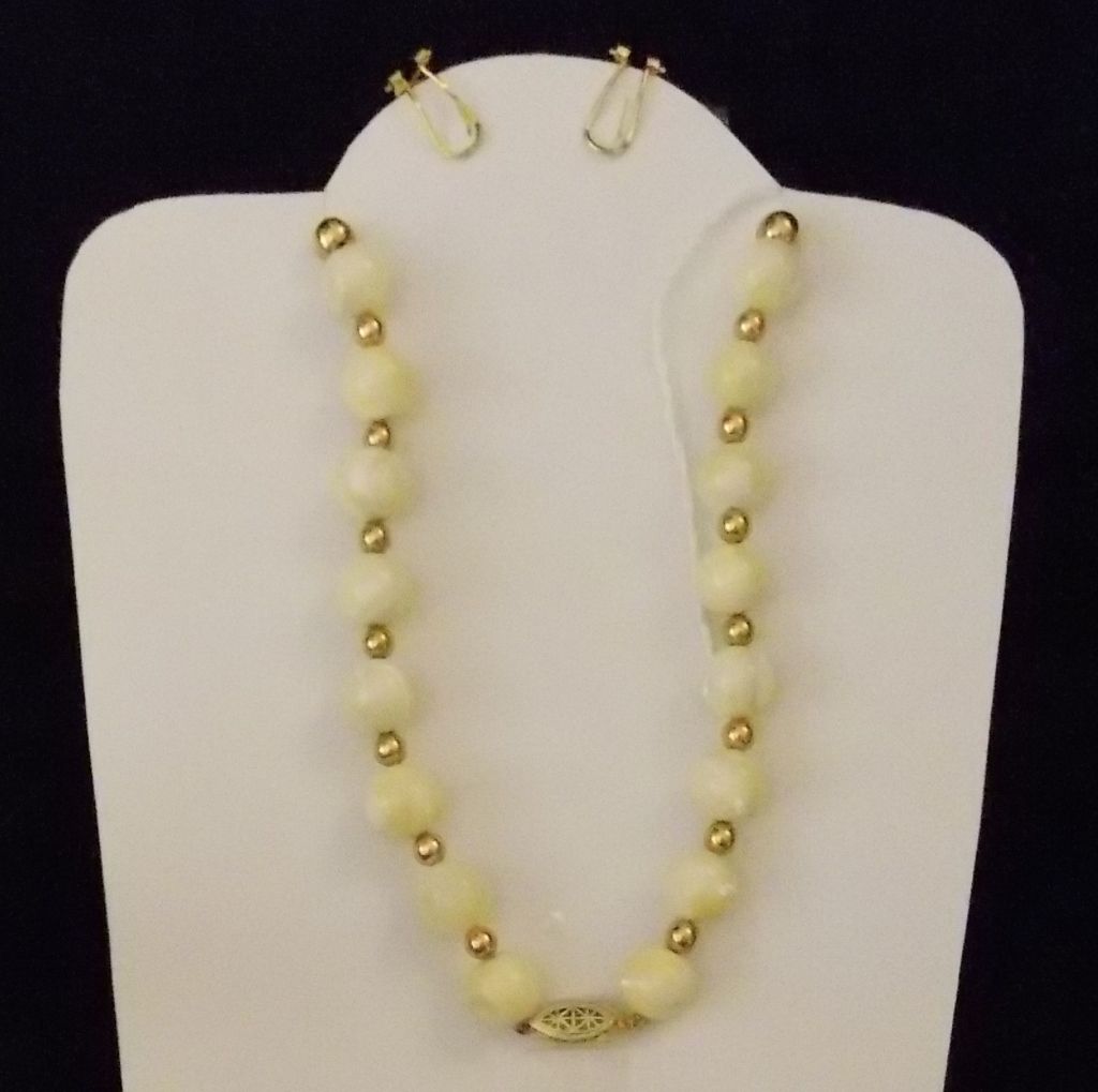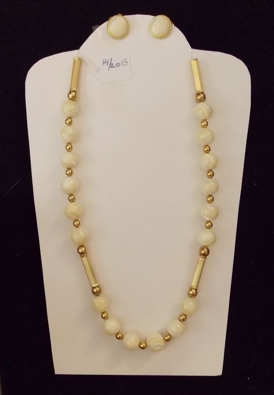 Costume Jewelry Necklace and Ear Ring set with Gold Beads and Mother of Pearl. Stamped 14/20 G.Comes as shown in Photos. Case for display only and is not included.