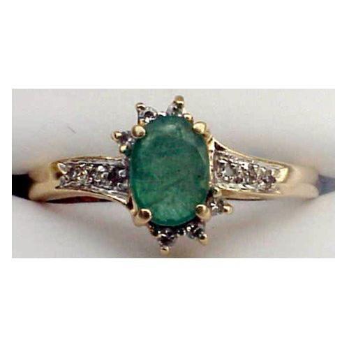 This emerald is 6mm x 8mm - approximately 1.5 cts. It is accented by 3 diamonds on each side of band and 3 diamonds on each side of emerald.