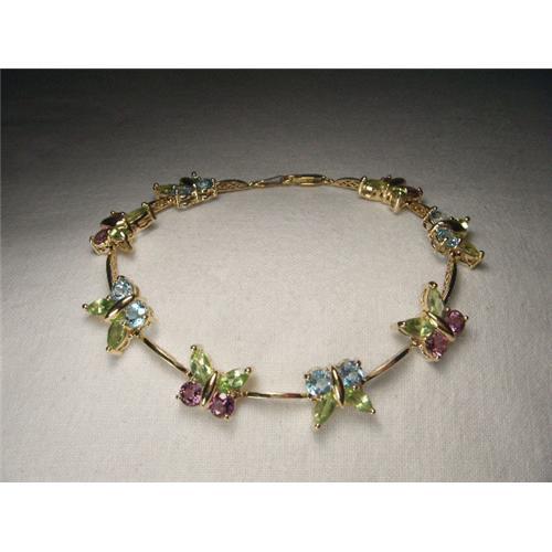 You are looking at an estate 10K yellow gold butterfly tennis bracelet with gemstones. This beautiful piece features 16 marquise cut peridots measuring 5 mm by 3 mm, 8 round amethysts and 8 round blue topazes measuring 4 mm each. All gemstones are natural. The bracelet measures 7 and 3/8 inches long by 3/8 of an inch wide. It weighs 8.9 grams. It is in mint condition.