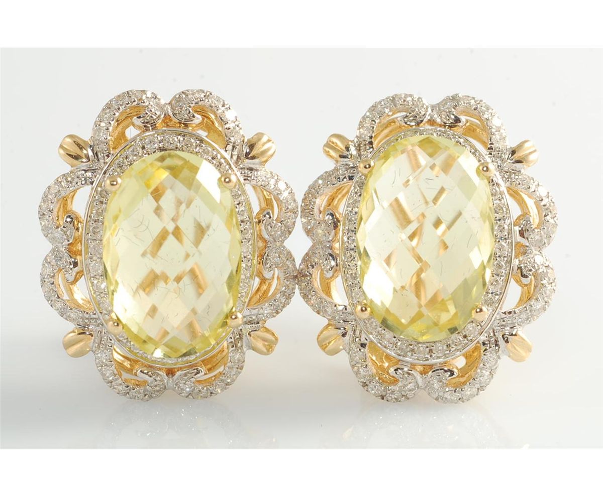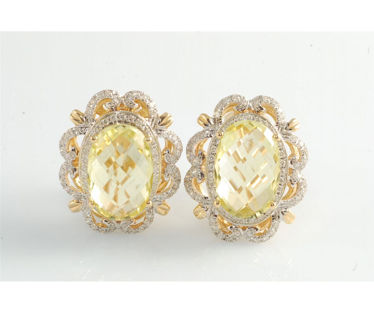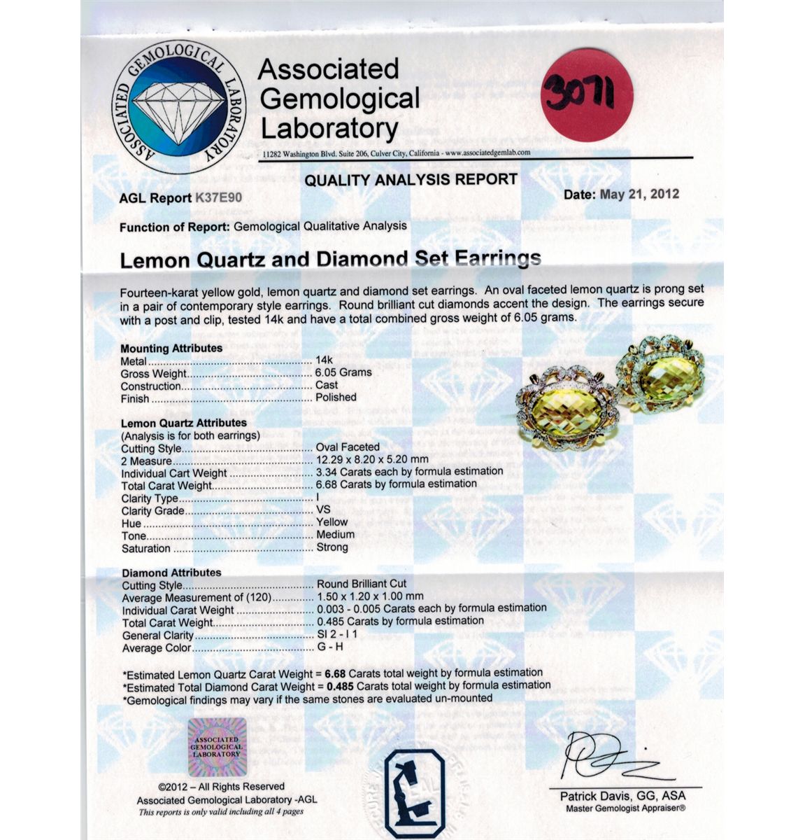 14K Yellow Gold, Lemon Quartz (6.68ct) and Diamond (0.485 ct) Set Earrings. An oval faceted Lemon Quartz is prong set in a pair of contemporary style earrings. Round brilliant cut diamonds accent the design. The earrings secure with a post clip, tested 14K and have a total cambined gross weight of 6.05 grams.
