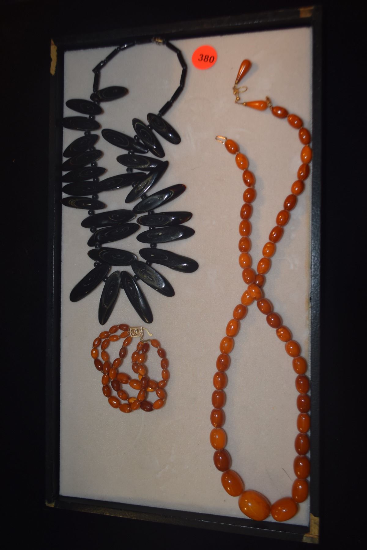 14K AMBER NECKLACE & BRACELET, AMBER EARRINGS & BLACK CORAL NECKLACE (4 PCS)