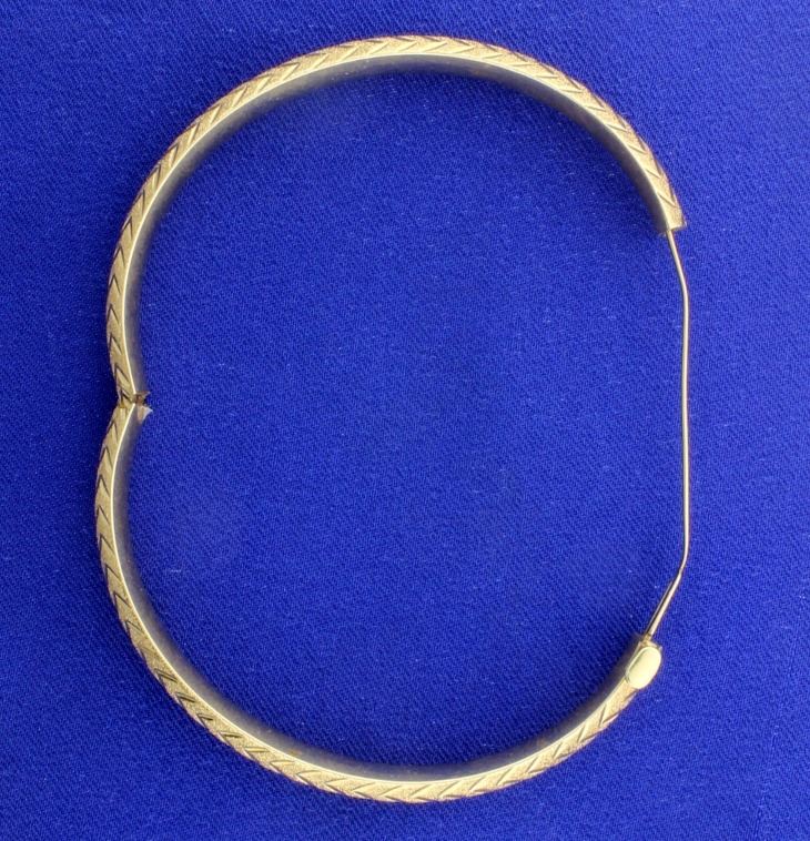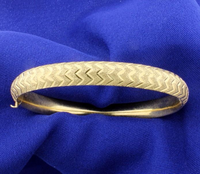 It is 14K yellow gold, the bangle is 2 1/2 inches in diameter and 8.1mm wide. 11.6g